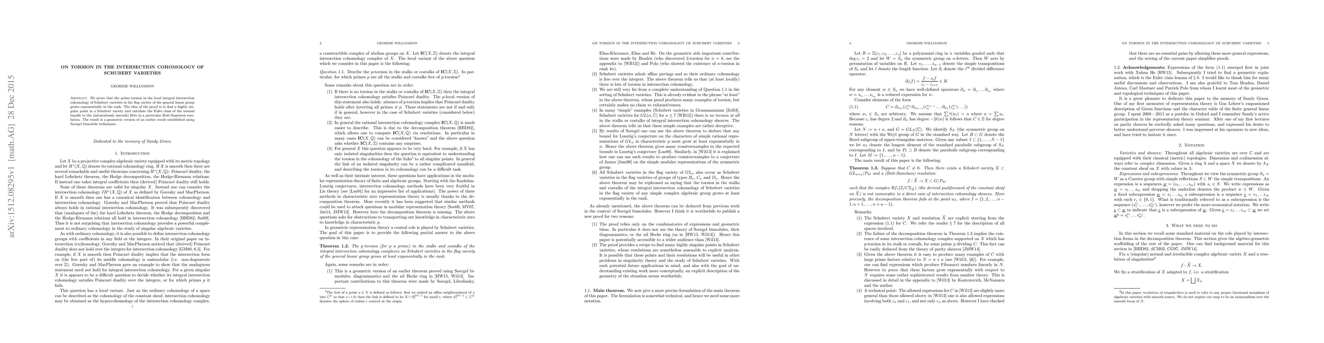 We prove that the prime torsion in the local integral intersection cohomology of Schubert varieties in the flag variety of the general linear group grows exponentially in the rank. The idea of the proof is to find a highly singular point in a Schubert variety and calculate the Euler class of the normal bundle to the (miraculously smooth) fibre in a particular Bott-Samelson resolution. The result is a geometric version of an earlier result established using Soergel bimodule techniques.