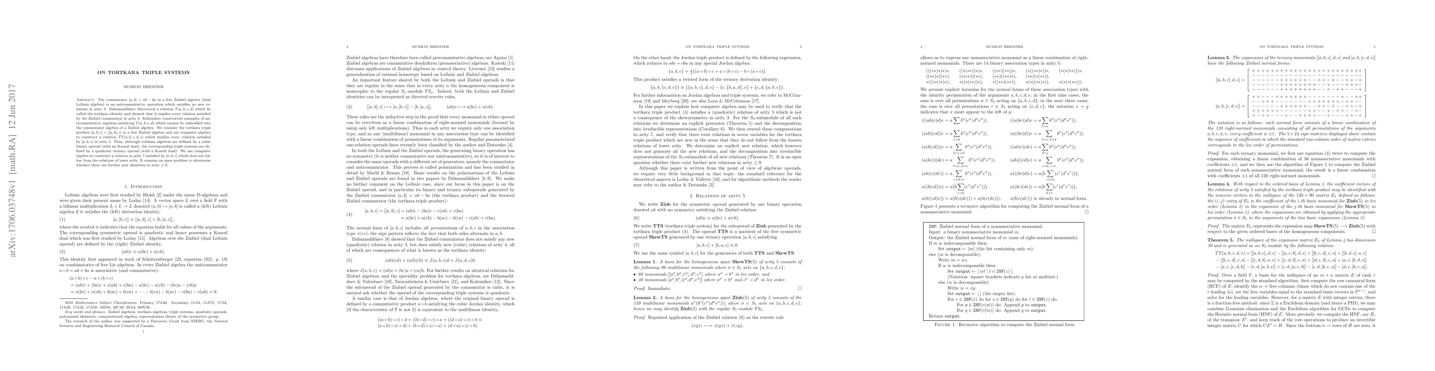 The commutator $[a,b] = ab - ba$ in a free Zinbiel algebra (dual Leibniz algebra) is an anticommutative operation which satisfies no new relations in arity 3. Dzhumadildaev discovered a relation $T(a,b,c,d)$ which he called the tortkara identity and showed that it implies every relation satisfied by the Zinbiel commutator in arity 4. Kolesnikov constructed examples of anticommutative algebras satisfying $T(a,b,c,d)$ which cannot be embedded into the commutator algebra of a Zinbiel algebra. We consider the tortkara triple product $[a,b,c] = [[a,b],c]$ in a free Zinbiel algebra and use computer algebra to construct a relation $TT(a,b,c,d,e)$ which implies every relation satisfied by $[a,b,c]$ in arity 5. Thus, although tortkara algebras are defined by a cubic binary operad (with no Koszul dual), the corresponding triple systems are defined by a quadratic ternary operad (with a Koszul dual). We use computer algebra to construct a relation in arity 7 satisfied by $[a,b,c]$ which does not follow from the relations of lower arity. It remains an open problem to determine whether there are further new identities in arity $\ge 9$.