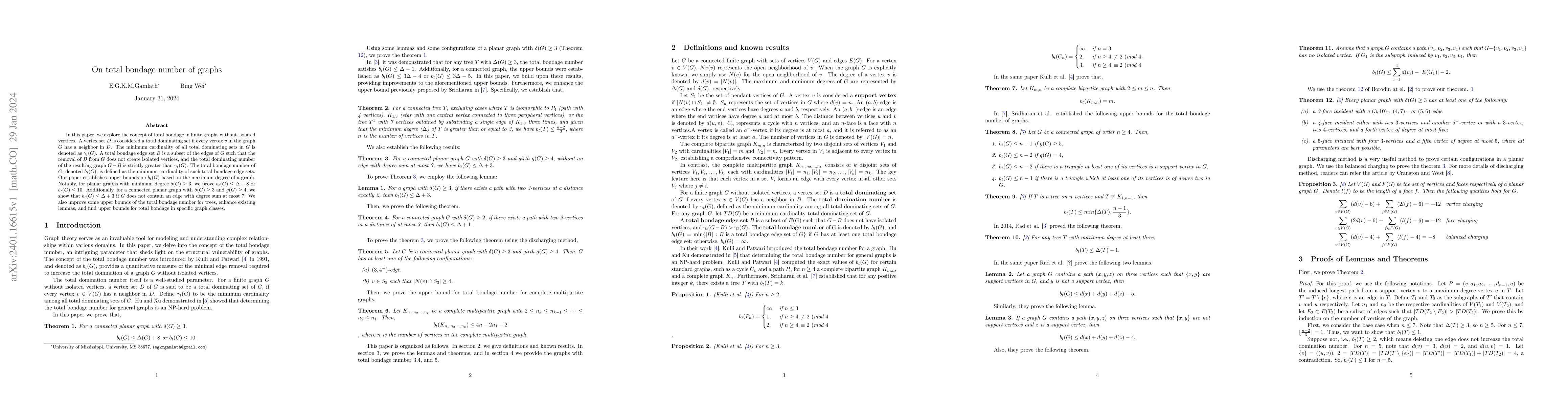 This paper investigates the total bondage number in finite graphs, defining it as the minimum size of edge sets whose removal increases the total dominating number. It establishes upper bounds on this number based on the graph's maximum degree, notably proving $b_t(G) \leq \Delta + 8$ or $b_t(G) \leq 10$ for planar graphs with minimum degree $\delta(G) \geq 3$.