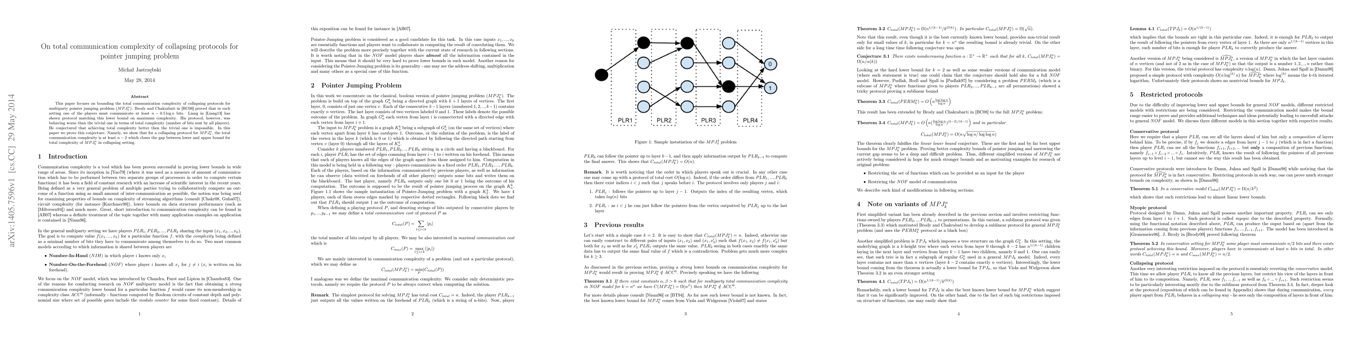 This paper focuses on bounding the total communication complexity of collapsing protocols for multiparty pointer jumping problem ($MPJ_k^n$). Brody and Chakrabati in \cite{bc08} proved that in such setting one of the players must communicate at least $n - 0.5\log{n}$ bits. Liang in \cite{liang} has shown protocol matching this lower bound on maximum complexity. His protocol, however, was behaving worse than the trivial one in terms of total complexity (number of bits sent by all players). He conjectured that achieving total complexity better then the trivial one is impossible. In this paper we prove this conjecture. Namely, we show that for a collapsing protocol for $MPJ_k^n$, the total communication complexity is at least $n-2$ which closes the gap between lower and upper bound for total complexity of $MPJ_k^n$ in collapsing setting.