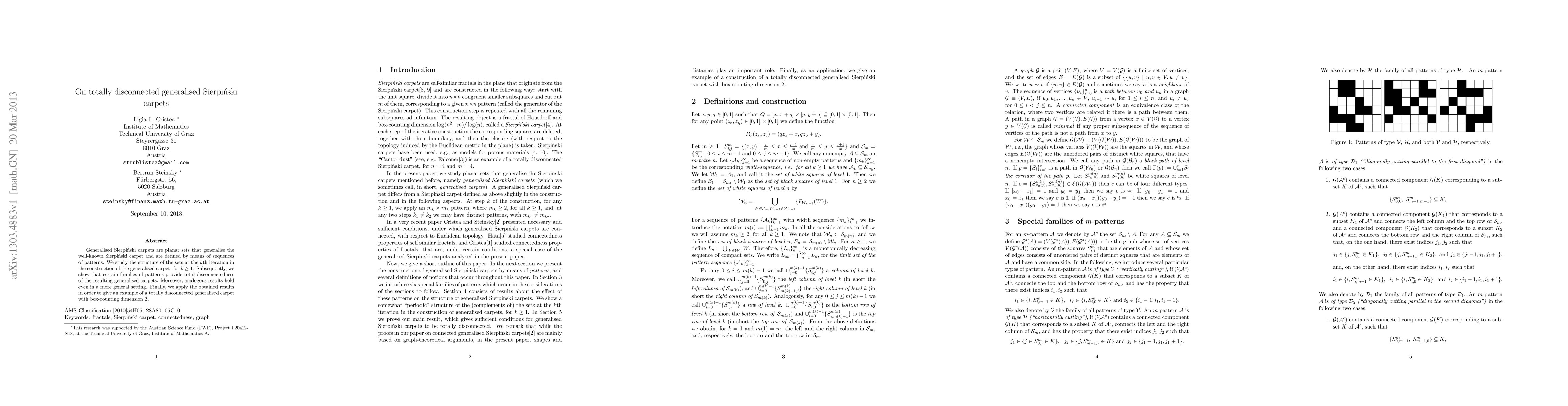 This paper investigates the structure of generalised Sierpinski carpets at each iteration, demonstrating that specific pattern sequences result in total disconnectedness. It also extends these findings to broader settings and showcases an example of a totally disconnected generalised carpet with a box-counting dimension of 2.