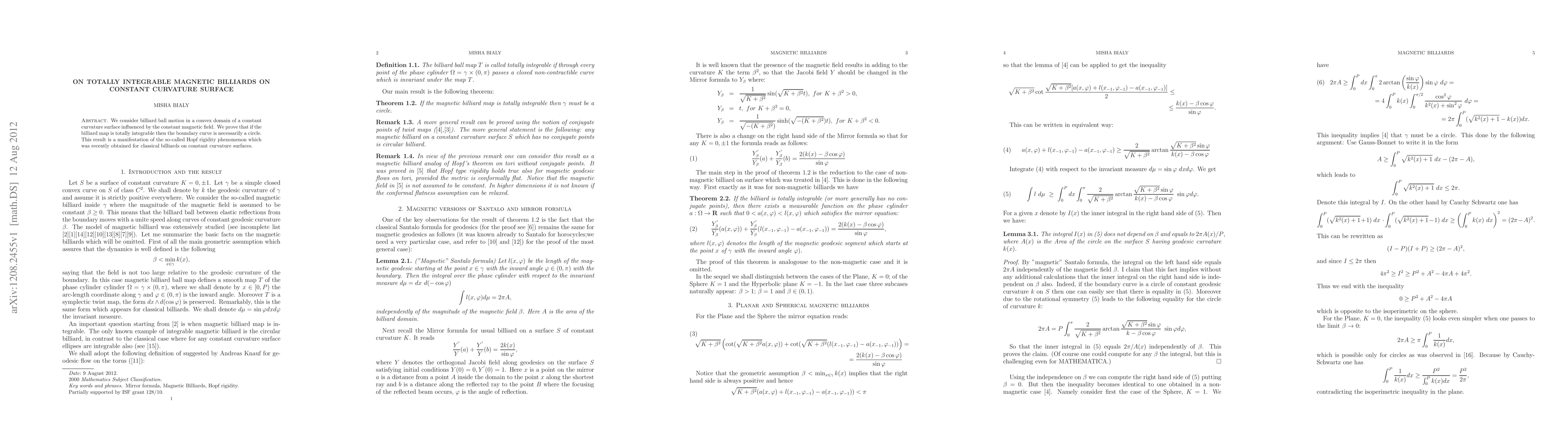 Summary: This paper proves that in convex domains of constant curvature surfaces, totally integrable magnetic billiards have circular boundaries, demonstrating the Hopf rigidity phenomenon in the magnetic context. This extends classical rigidity results to magnetic systems.