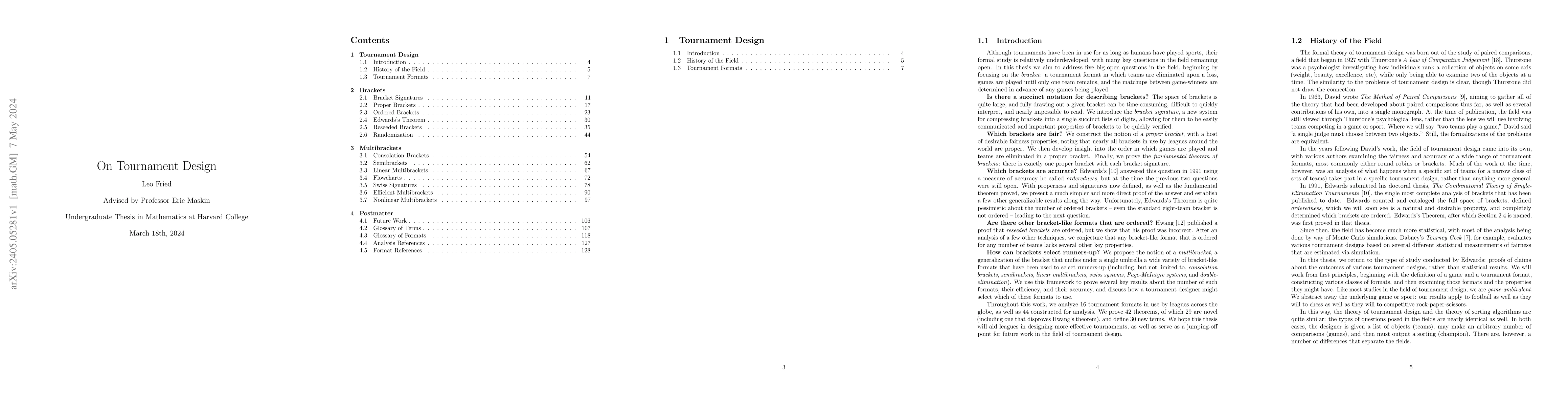 Summary: This monograph explores the theory behind tournament design, with an emphasis on the construction and analysis of brackets and multibrackets used in competitive tournaments. It provides detailed insights into the mathematical and algorithmic frameworks underpinning these structures.