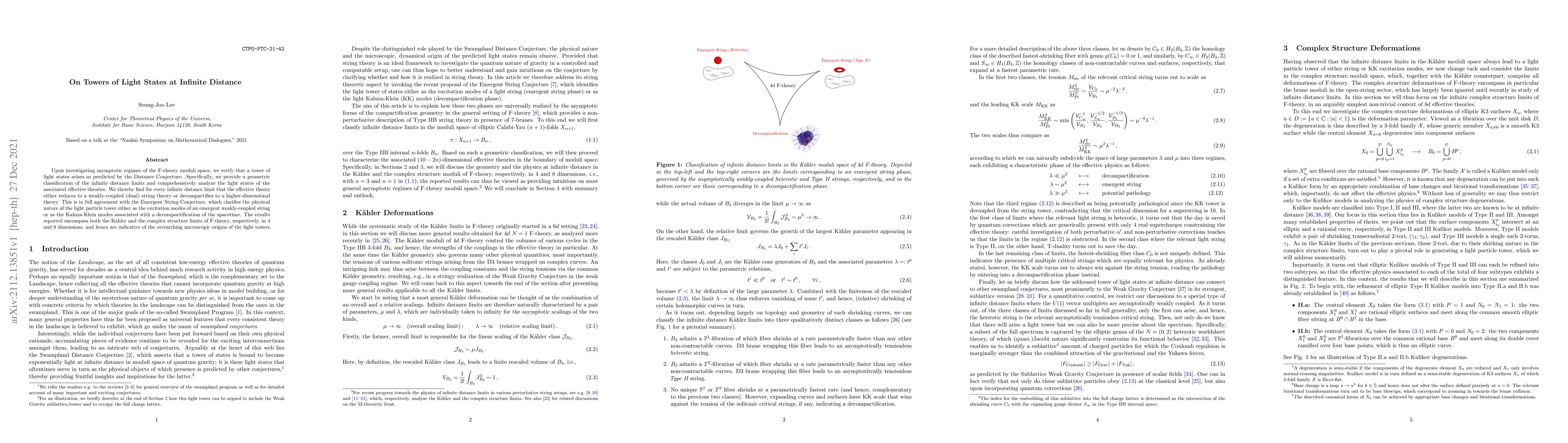 Upon investigating asymptotic regimes of the F-theory moduli space, we verify that a tower of light states arises as predicted by the Distance Conjecture. Specifically, we provide a geometric classification of the infinite distance limits and comprehensively analyze the light states of the associated effective theories. We thereby find for every infinite distance limit that the effective theory either reduces to a weakly-coupled (dual) string theory or decompactifies to a higher-dimensional theory. This is in full agreement with the Emergent String Conjecture, which clarifies the physical nature of the light particle tower either as the excitation modes of an emergent weakly-coupled string or as the Kaluza-Klein modes associated with a decompactification of the spacetime. The results reported encompass both the K\"ahler and the complex structure limits of F-theory, respectively, in $4$ and $8$ dimensions, and hence are indicative of the overarching microscopic origins of the light towers.