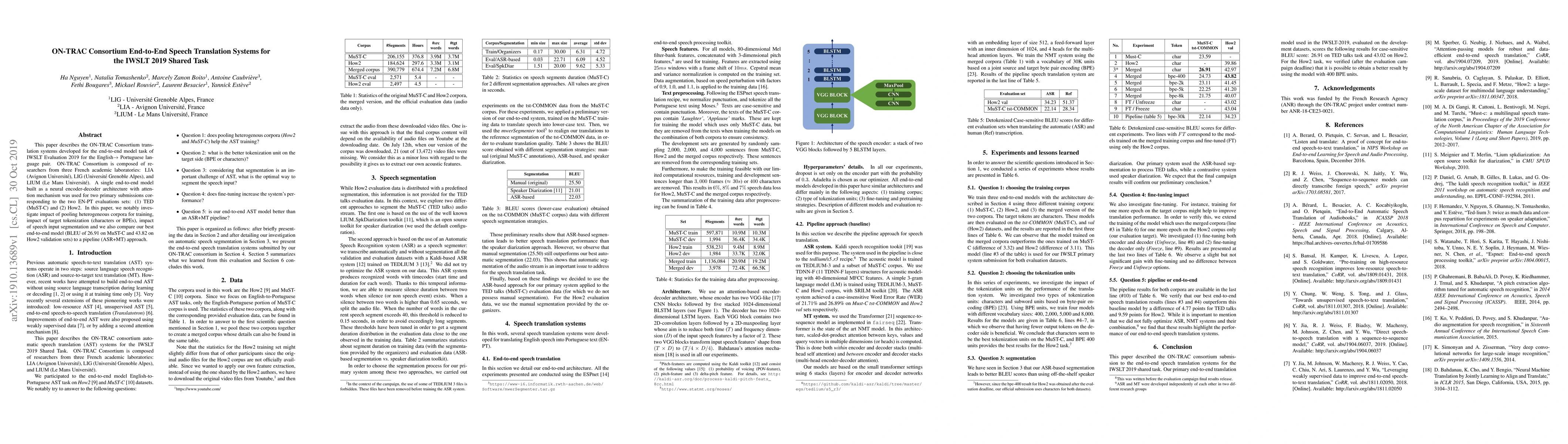 This paper describes the ON-TRAC Consortium translation systems developed for the end-to-end model task of IWSLT Evaluation 2019 for the English-to-Portuguese language pair. ON-TRAC Consortium is composed of researchers from three French academic laboratories: LIA (Avignon Universit\'e), LIG (Universit\'e Grenoble Alpes), and LIUM (Le Mans Universit\'e). A single end-to-end model built as a neural encoder-decoder architecture with attention mechanism was used for two primary submissions corresponding to the two EN-PT evaluations sets: (1) TED (MuST-C) and (2) How2. In this paper, we notably investigate impact of pooling heterogeneous corpora for training, impact of target tokenization (characters or BPEs), impact of speech input segmentation and we also compare our best end-to-end model (BLEU of 26.91 on MuST-C and 43.82 on How2 validation sets) to a pipeline (ASR+MT) approach.