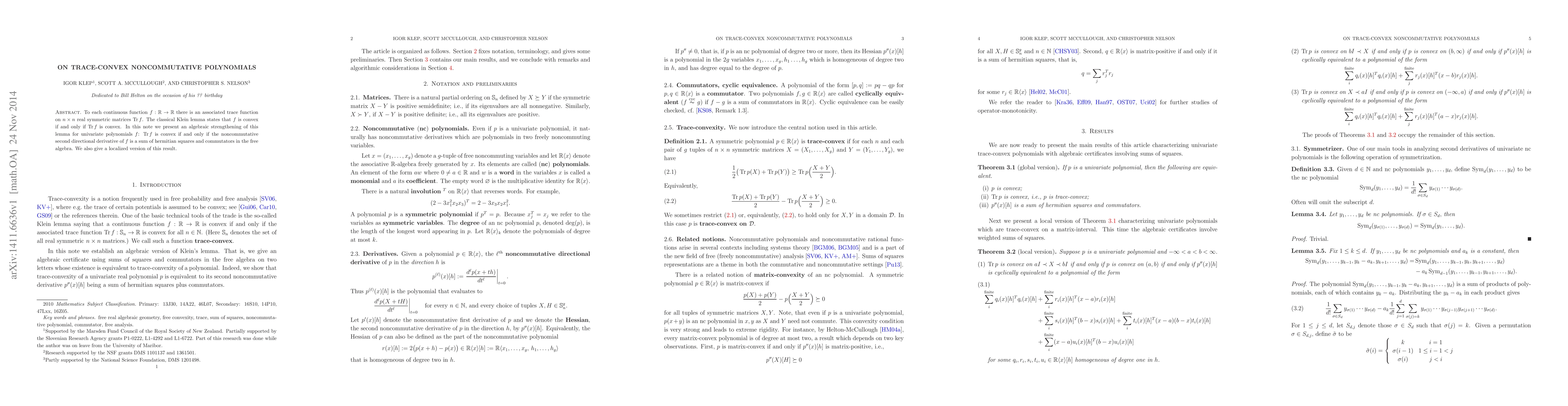 To each real continuous function f there is an associated trace function on real symmetric matrices Tr f. The classical Klein lemma states that f is convex if and only if Tr f is convex. In this note we present an algebraic strengthening of this lemma for univariate polynomials f: Tr f is convex if and only if the noncommutative second directional derivative of f is a sum of hermitian squares and commutators in a free algebra. We also give a localized version of this result.