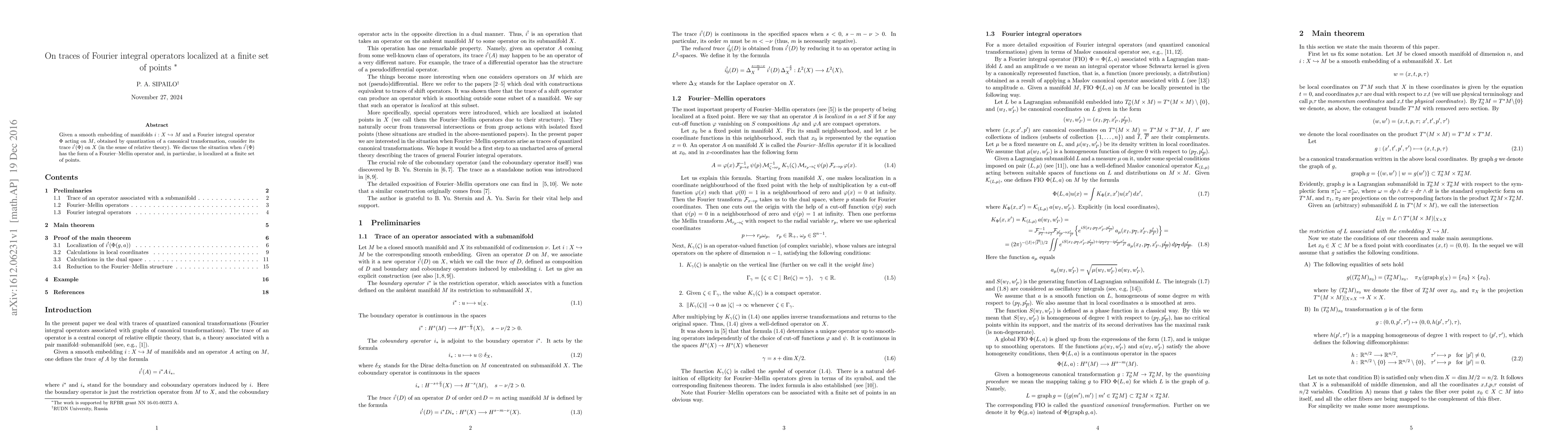 Given a smooth embedding of manifolds $i: X \hookrightarrow M$ and a Fourier integral operator $\Phi$ acting on $M$, obtained by quantization of a canonical transformation, consider its trace $i^!(\Phi)$ on $X$ (in the sense of relative theory). We discuss the situation when $i^!(\Phi)$ has the form of a Fourier--Mellin operator and, in particular, is localized at a finite set of points.