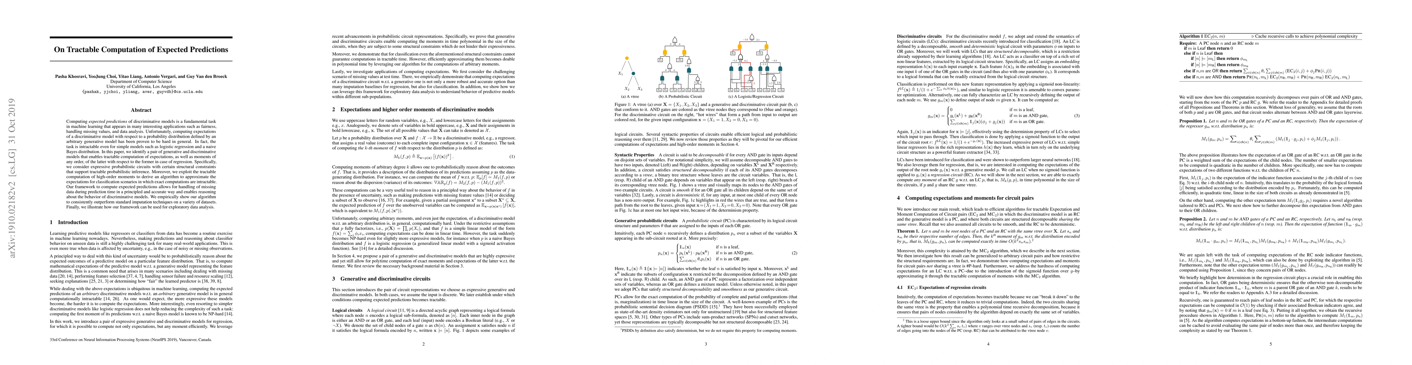 Computing expected predictions of discriminative models is a fundamental task in machine learning that appears in many interesting applications such as fairness, handling missing values, and data analysis. Unfortunately, computing expectations of a discriminative model with respect to a probability distribution defined by an arbitrary generative model has been proven to be hard in general. In fact, the task is intractable even for simple models such as logistic regression and a naive Bayes distribution. In this paper, we identify a pair of generative and discriminative models that enables tractable computation of expectations, as well as moments of any order, of the latter with respect to the former in case of regression. Specifically, we consider expressive probabilistic circuits with certain structural constraints that support tractable probabilistic inference. Moreover, we exploit the tractable computation of high-order moments to derive an algorithm to approximate the expectations for classification scenarios in which exact computations are intractable. Our framework to compute expected predictions allows for handling of missing data during prediction time in a principled and accurate way and enables reasoning about the behavior of discriminative models. We empirically show our algorithm to consistently outperform standard imputation techniques on a variety of datasets. Finally, we illustrate how our framework can be used for exploratory data analysis.