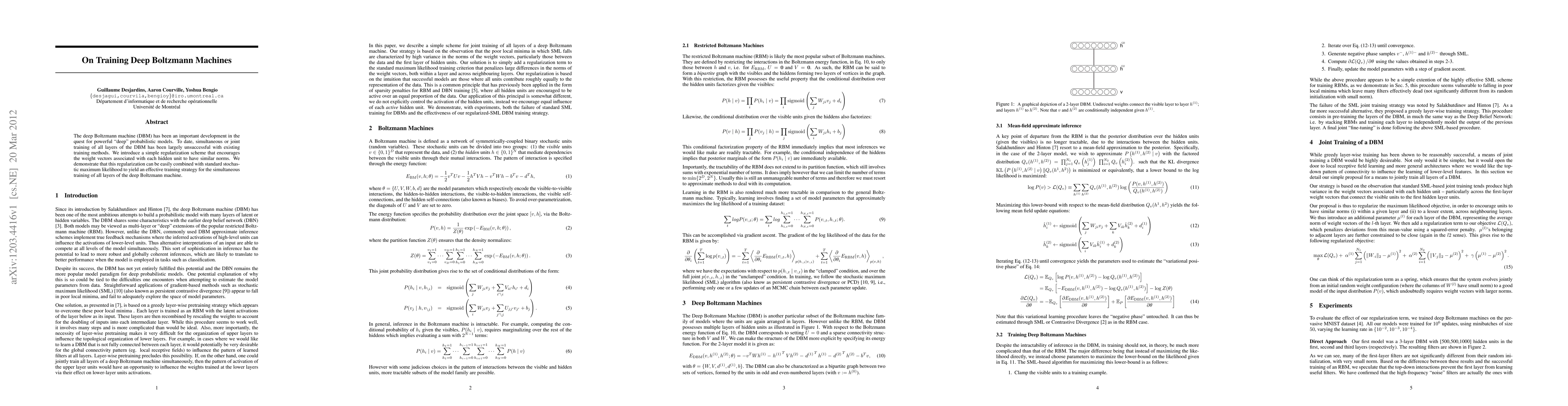 This paper introduces a regularization scheme to improve the training of deep Boltzmann machines (DBMs) by encouraging similar norms for weight vectors of hidden units, enabling effective simultaneous training of all layers using stochastic maximum likelihood.