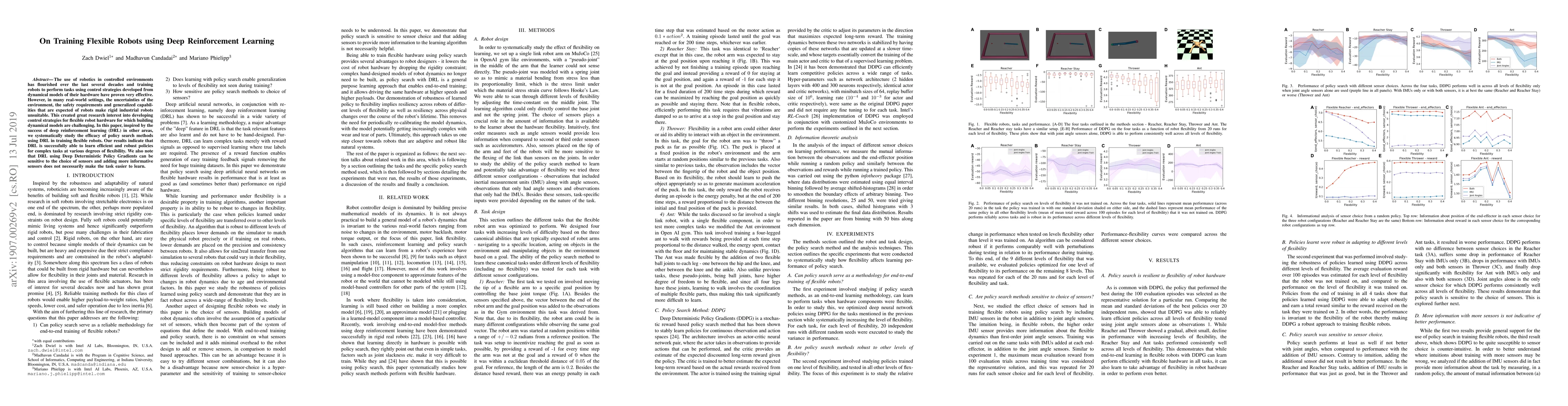 This paper investigates the application of deep reinforcement learning (DRL) for training flexible robots to perform complex tasks, demonstrating that DRL can develop efficient and robust policies despite environmental uncertainties. However, it finds that DRL's effectiveness can be sensitive to sensor choice, and additional sensors do not always improve task learning.
