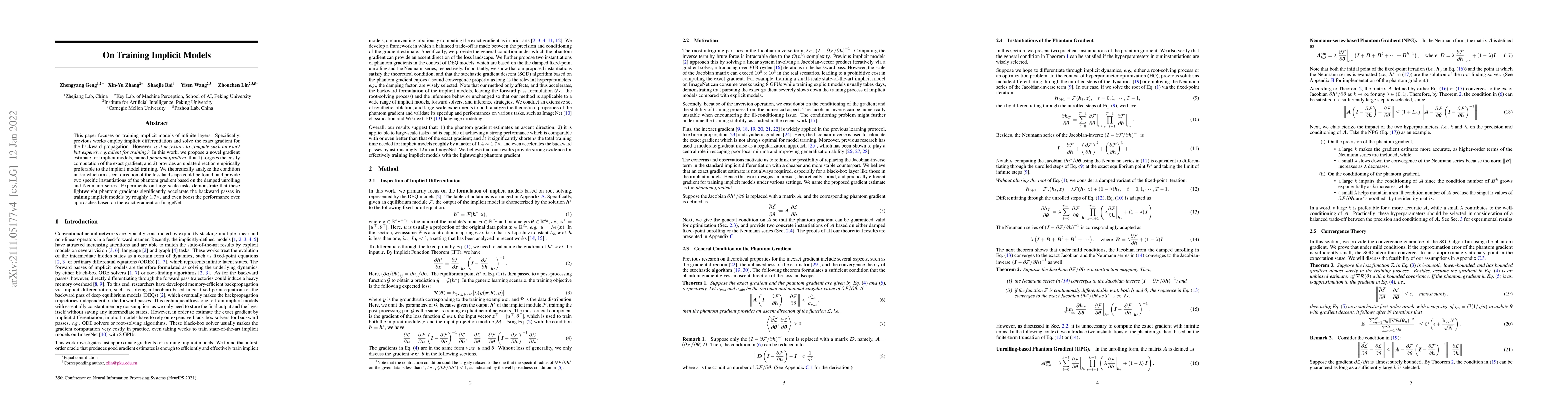This paper focuses on training implicit models of infinite layers. Specifically, previous works employ implicit differentiation and solve the exact gradient for the backward propagation. However, is it necessary to compute such an exact but expensive gradient for training? In this work, we propose a novel gradient estimate for implicit models, named phantom gradient, that 1) forgoes the costly computation of the exact gradient; and 2) provides an update direction empirically preferable to the implicit model training. We theoretically analyze the condition under which an ascent direction of the loss landscape could be found, and provide two specific instantiations of the phantom gradient based on the damped unrolling and Neumann series. Experiments on large-scale tasks demonstrate that these lightweight phantom gradients significantly accelerate the backward passes in training implicit models by roughly 1.7 times, and even boost the performance over approaches based on the exact gradient on ImageNet.