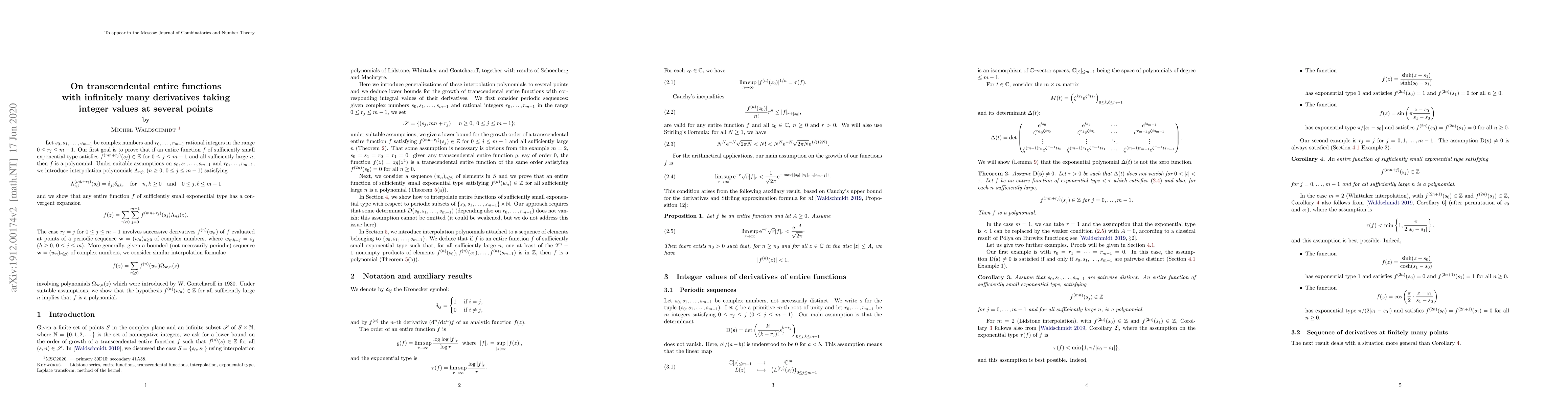 Let $s_0,s_1,\dots,s_{m-1}$ be complex numbers and $r_0,\dots,r_{m-1}$ rational integers in the range $0\le r_j\le m-1$. Our first goal is to prove that if an entire function $f$ of sufficiently small exponential type satisfies $f^{(mn+r_j)}(s_j)\in{\mathbb Z}$ for $0\le j\le m-1$ and all sufficiently large $n$, then $f$ is a polynomial. Under suitable assumptions on $s_0,s_1,\dots,s_{m-1}$ and $r_0,\dots,r_{m-1}$, we introduce interpolation polynomials $\Lambda_{nj}$, ($n\ge 0$, $0\le j\le m-1$) satisfying $$ \Lambda_{nj}^{(mk+r_\ell)}(s_\ell)=\delta_{j\ell}\delta_{nk}, \quad\hbox{for}\quad n, k\ge 0 \quad\hbox{and}\quad 0\le j, \ell\le m-1 $$ and we show that any entire function $f$ of sufficiently small exponential type has a convergent expansion $$ f(z)=\sum_{n\ge 0} \sum_{j=0}^{m-1}f^{(mn+r_j)}(s_j)\Lambda_{nj}(z). $$ The case $r_j=j$ for $0\le j\le m-1$ involves successive derivatives $f^{(n)}(w_n)$ of $f$ evaluated at points of a periodic sequence ${\mathbf{w}}=(w_n)_{n\ge 0}$ of complex numbers, where $w_{mh+j}=s_j$ ($h\ge 0$, $0\le j\le m$). More generally, given a bounded (not necessarily periodic) sequence ${\mathbf{w}}=(w_n)_{n\ge 0}$ of complex numbers, we consider similar interpolation formulae $$ f(z)=\sum_{n\ge 0}f^{(n)}(w_n)\Omega_{{\mathbf{w}},n}(z) $$ involving polynomials $\Omega_{{\mathbf{w}},n}(z)$ which were introduced by W.~Gontcharoff in 1930. Under suitable assumptions, we show that the hypothesis $f^{(n)}(w_n)\in{\mathbb Z}$ for all sufficiently large $n$ implies that $f$ is a polynomial.