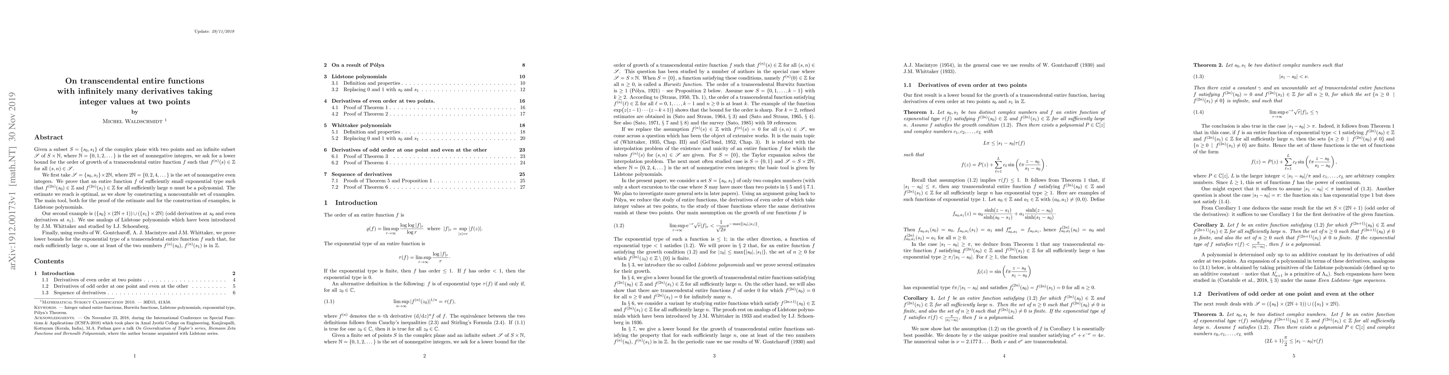 Given a subset $S=\{s_0, s_1\}$ of the complex plane with two points and an infinite subset ${\mathscr S}$ of $S\times {\mathbb N}$, where ${\mathbb N}=\{0,1,2,\dots\}$ is the set of nonnegative integers, we ask for a lower bound for the order of growth of a transcendental entire function $f$ such that $f^{(n)}(s)\in{\mathbb Z}$ for all $(s,n)\in{\mathscr S}$. We first take ${\mathscr S}=\{s_0,s_1\}\times 2{\mathbb N}$, where $2{\mathbb N}=\{0,2,4,\dots\}$ is the set of nonnegative even integers. We prove that an entire function $f$ of sufficiently small exponential type such that $f^{(2n)}(s_0)\in{\mathbb Z}$ and $f^{(2n)}( s_1)\in{\mathbb Z}$ for all sufficiently large $n$ must be a polynomial. The estimate we reach is optimal, as we show by constructing a noncountable set of examples. The main tool, both for the proof of the estimate and for the construction of examples, is Lidstone polynomials. Our second example is $(\{s_0\}\times (2{\mathbb N}+1))\cup( \{ s_1\}\times 2{\mathbb N})$ (odd derivatives at $s_0$ and even derivatives at $ s_1$). We use analogs of Lidstone polynomials which have been introduced by J.M.~Whittaker and studied by I.J.~Schoenberg. Finally, using results of W.~Gontcharoff, A. J.~Macintyre and J.M.~Whittaker, we prove lower bounds for the exponential type of a transcendental entire function $f$ such that, for each sufficiently large $n$, one at least of the two numbers $f^{(n)}(s_0)$, $f^{(n)}(s_1)$ is in ${\mathbb Z}$.