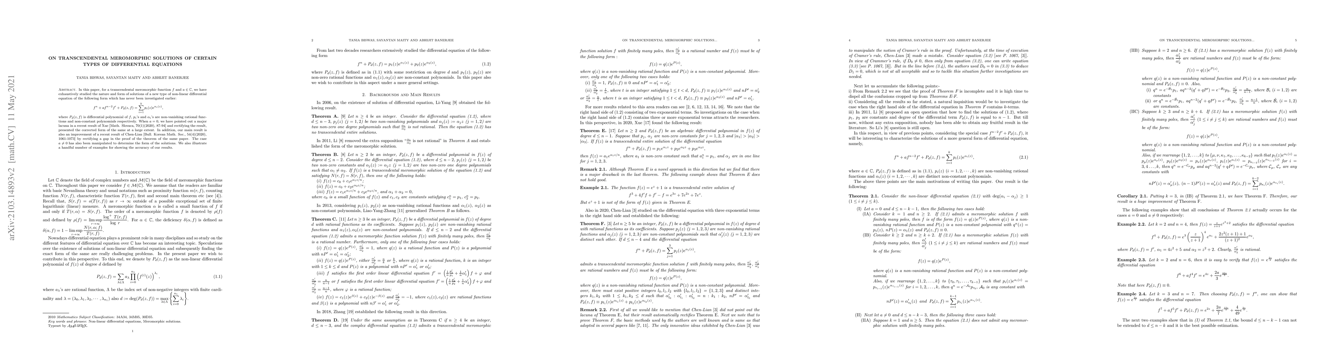 In this paper, for a transcendental meromorphic function $f$ and $a\in \mathbb{C}$, we have exhaustively studied the nature and form of solutions of a new type of non-linear differential equation of the following form which has never been investigated earlier: \beas f^n+af^{n-2}f'+ P_d(z,f) = \sum_{i=1}^{k}p_i(z)e^{\alpha_i(z)},\eeas where $P_d(z,f)$ is differential polynomial of $f$, $p_i$'s and $\alpha_{i}$'s are non-vanishing rational functions and non-constant polynomials respectively. When $a=0$, we have pointed out a major lacuna in a recent result of Xue [Math. Slovaca, 70(1)(2020), 87-94] and rectifying the result, presented the corrected form of the same at a large extent. The case $a\neq 0$ has also been manipulated to determine the form of the solutions. We also illustrate a handful number of examples for showing the accuracy of our results.