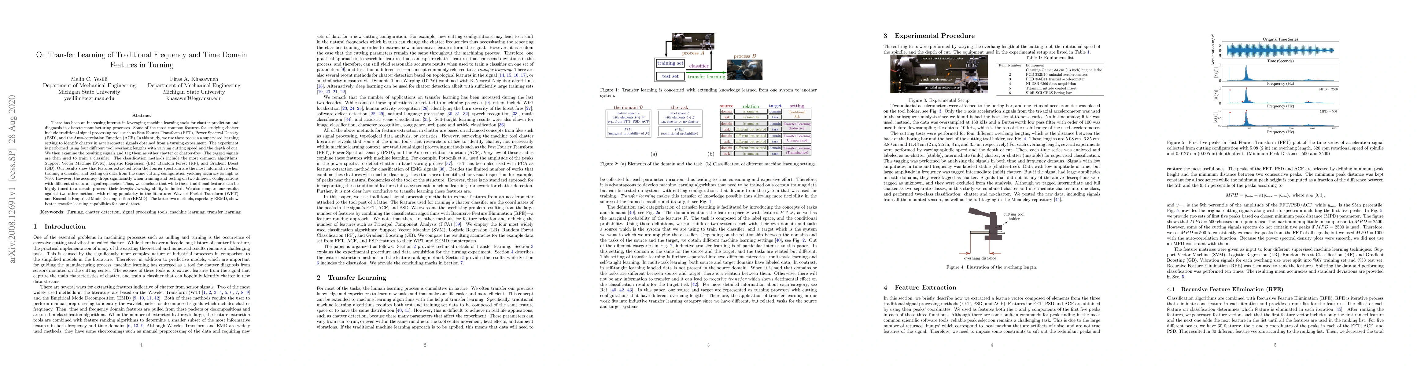 This study investigates the use of traditional frequency and time domain features for chatter prediction in turning processes using machine learning classifiers. Results show high accuracy for same-configuration training and testing but poor transfer learning across different configurations, indicating limited adaptability of these features. Comparatively, methods like EEMD demonstrate better transfer learning capabilities.