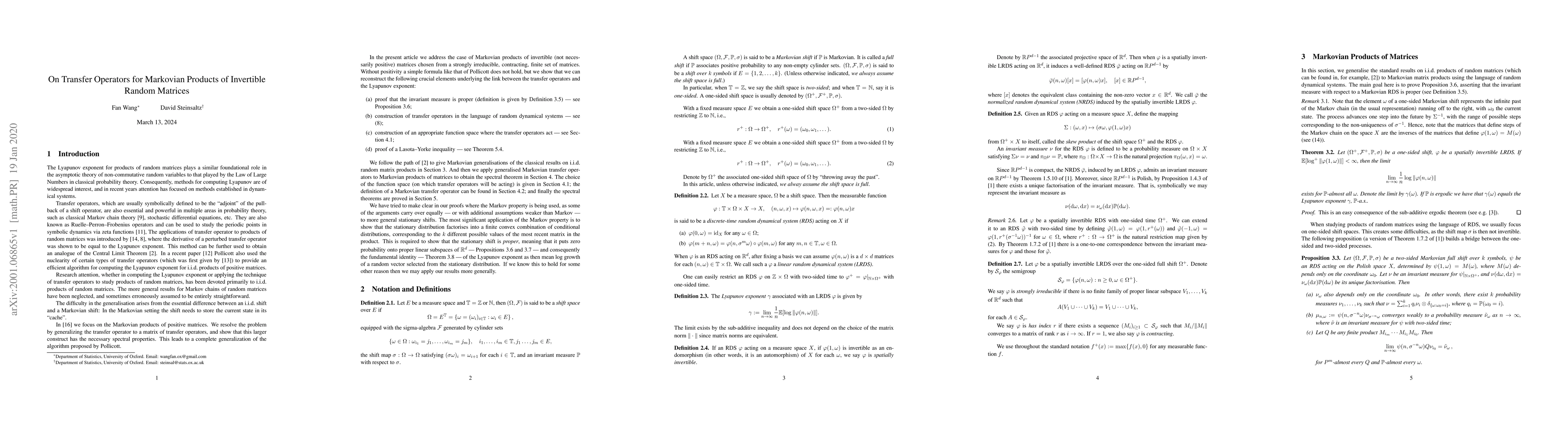 This paper constructs Markovian transfer operators for products of invertible random matrices from a strongly irreducible, contracting set, and proves a spectral property linking the top Lyapunov exponent of the matrix product problem to the operator's spectrum.