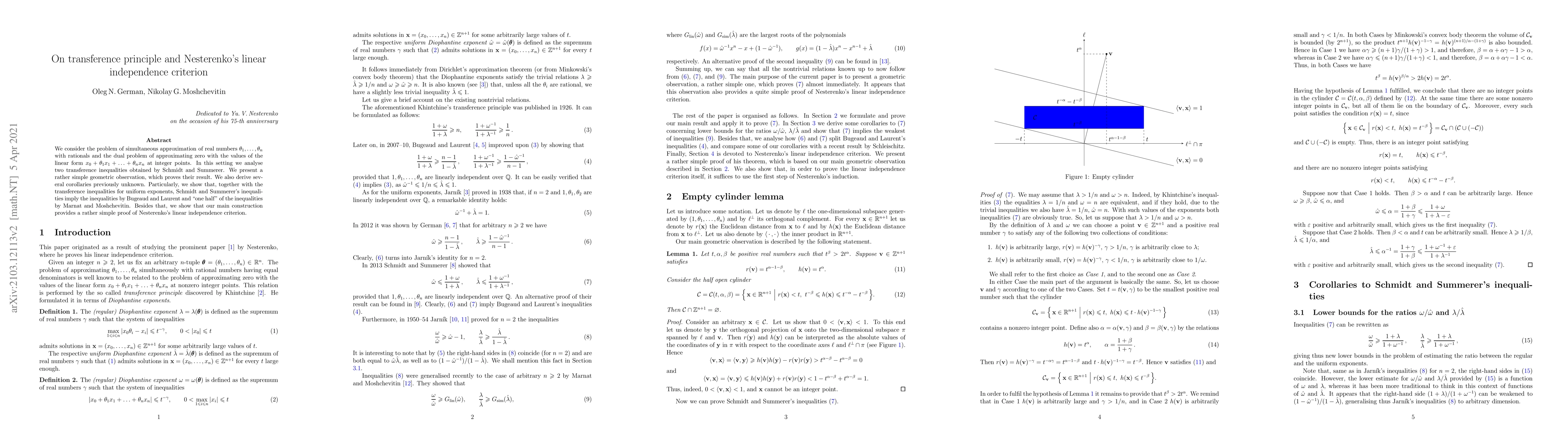 We consider the problem of simultaneous approximation of real numbers $\theta_1, \ldots,\theta_n$ with rationals and the dual problem of approximating zero with the values of the linear form $x_0+\theta_1x_1+\ldots+\theta_nx_n$ at integer points. In this setting we analyse two transference inequalities obtained by Schmidt and Summerer. We present a rather simple geometric observation, which proves their result. We also derive several corollaries previously unknown. Particularly, we show that, together with the transference inequalities for uniform exponents, Schmidt and Summerer's inequalities imply the inequalities by Bugeaud and Laurent and "one half" of the inequalities by Marnat and Moshchevitin. Besides that, we show that our main construction provides a rather simple proof of Nesterenko's linear independence criterion.