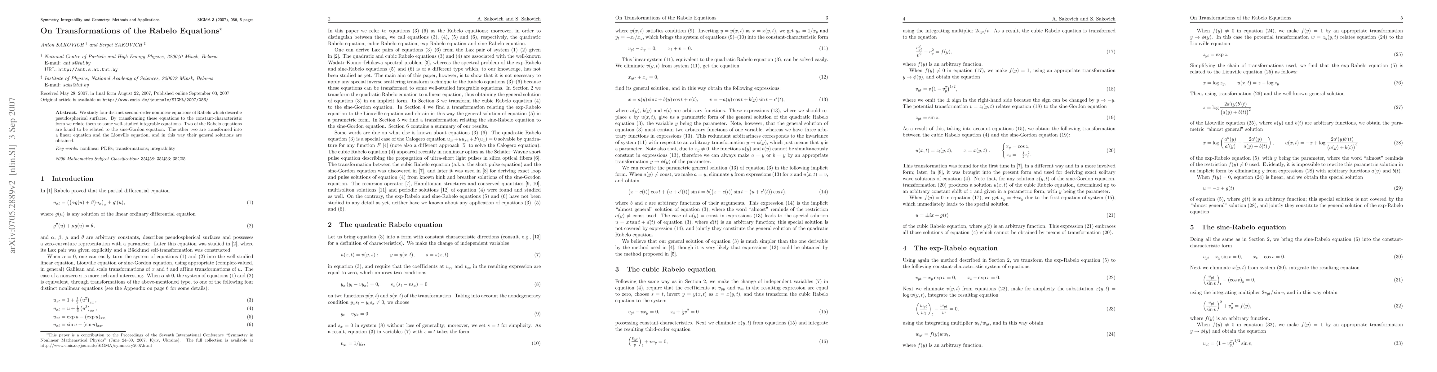 Researchers transformed four distinct nonlinear Rabelo equations into more recognizable forms, revealing connections to the sine-Gordon equation and general solutions of the Liouville equation.