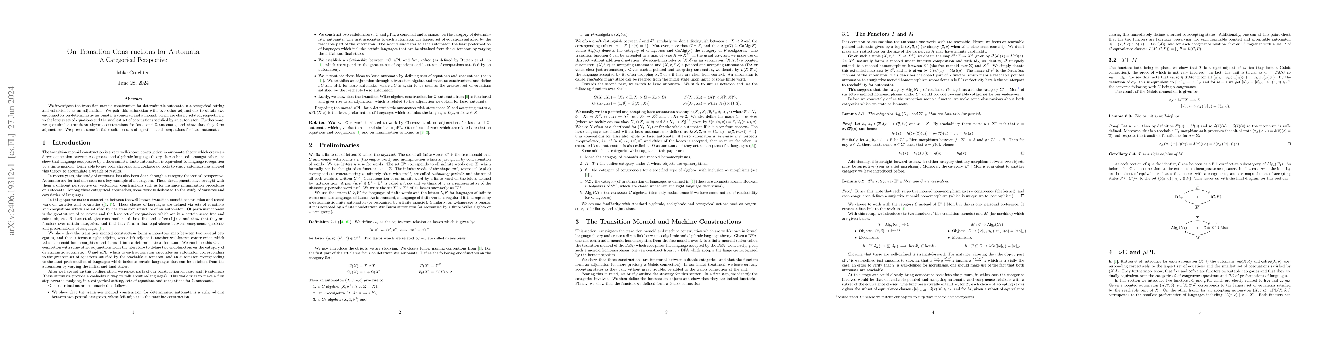 This paper explores transition monoid constructions for deterministic automata through a categorical lens, establishing adjunctions and deriving comonads and monads linked to sets of equations and coequations. It also extends these constructions to lasso and {\Omega}-automata, presenting initial results on their respective sets of equations and coequations.