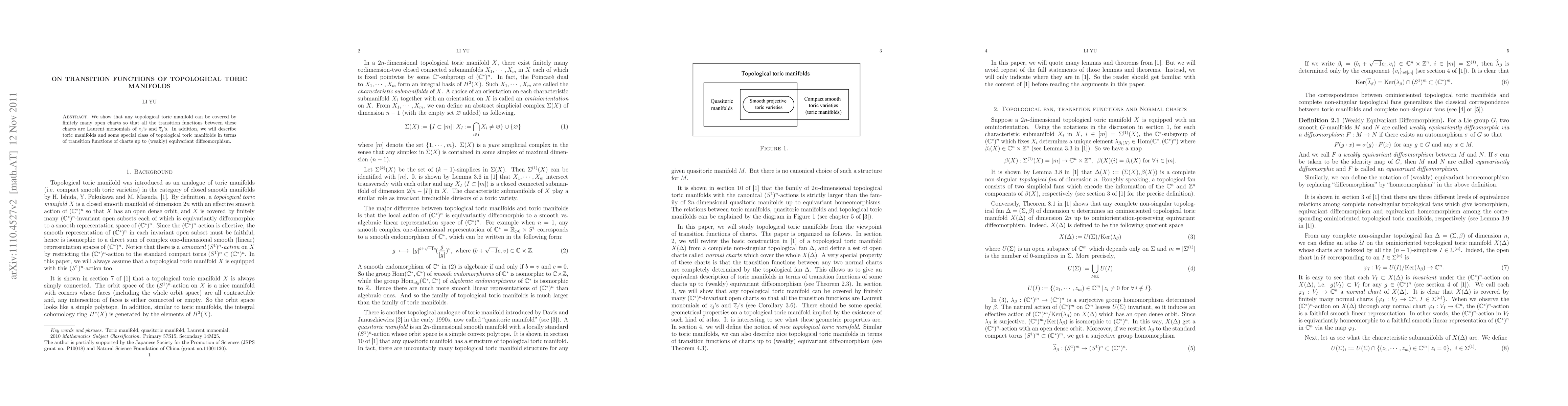 This paper demonstrates that topological toric manifolds can be covered by finitely many charts with transition functions that are Laurent monomials in $z_j$'s and $\bar{z}_j$'s. It also explores the classification of toric manifolds through the transition functions of their charts, up to equivariant diffeomorphism.