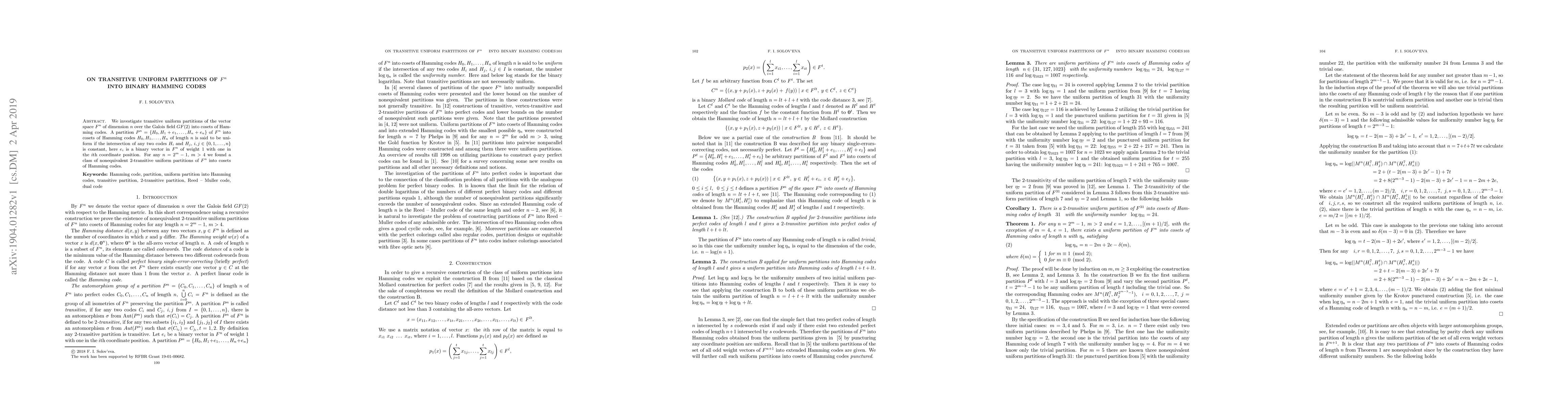 This paper explores uniform partitions of the vector space $F^n$ into cosets of Hamming codes, where the intersection size between any two codes is constant. It identifies a class of nonequivalent 2-transitive uniform partitions for $n=2^m-1$, $m>4$.