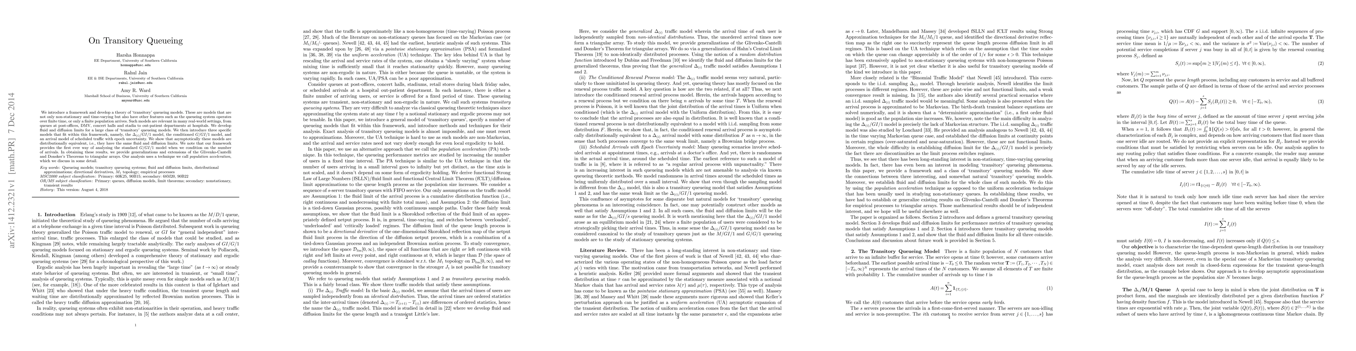 We introduce a framework and develop a theory of transitory queueing models. These are models that are not only non-stationary and time-varying but also have other features such as the queueing system operates over finite time, or only a finite population arrives. Such models are relevant in many real-world settings, from queues at post-offces, DMV, concert halls and stadia to out-patient departments at hospitals. We develop fluid and diffusion limits for a large class of transitory queueing models. We then introduce three specific models that fit within this framework, namely, the Delta(i)/GI/1 model, the conditioned G/GI/1 model, and an arrival model of scheduled traffic with epoch uncertainty. We show that asymptotically these models are distributionally equivalent, i.e., they have the same fluid and diffusion limits. We note that our framework provides the first ever way of analyzing the standard G/GI/1 model when we condition on the number of arrivals. In obtaining these results, we provide generalizations and extensions of the Glivenko-Cantelli and Donskers Theorem for empirical processes with triangular arrays. Our analysis uses the population acceleration technique that we introduce and develop. This may be useful in analysis of other non-stationary and non-ergodic queuing models.