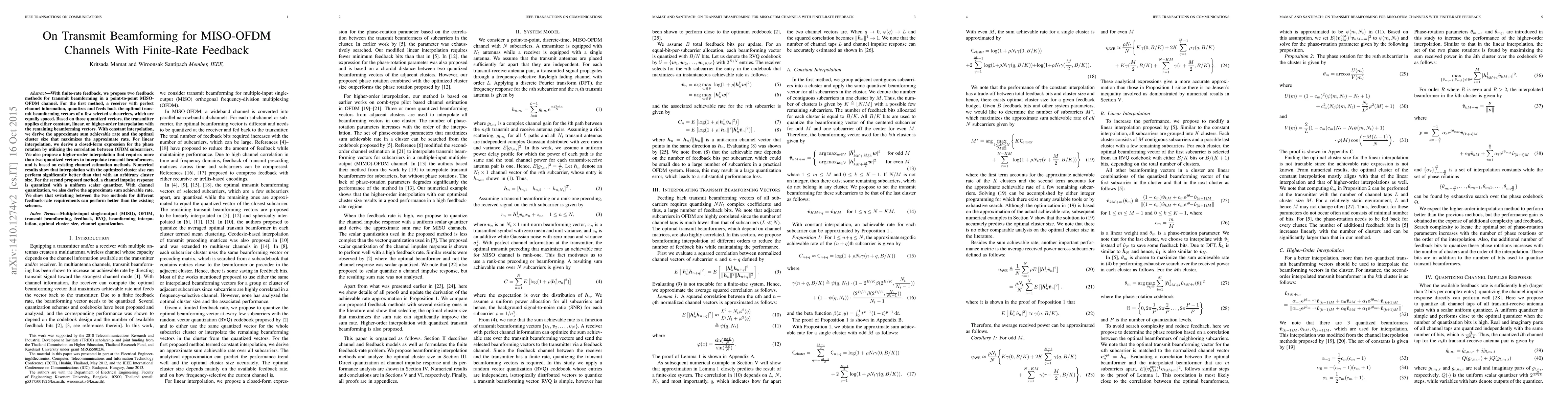 This paper proposes two feedback methods for transmit beamforming in MISO-OFDM channels with finite-rate feedback. The first method quantizes and feeds back optimal beamforming vectors for selected subcarriers, using interpolation techniques to estimate remaining vectors. The second method quantizes the channel impulse response, and both methods are shown to outperform existing schemes.