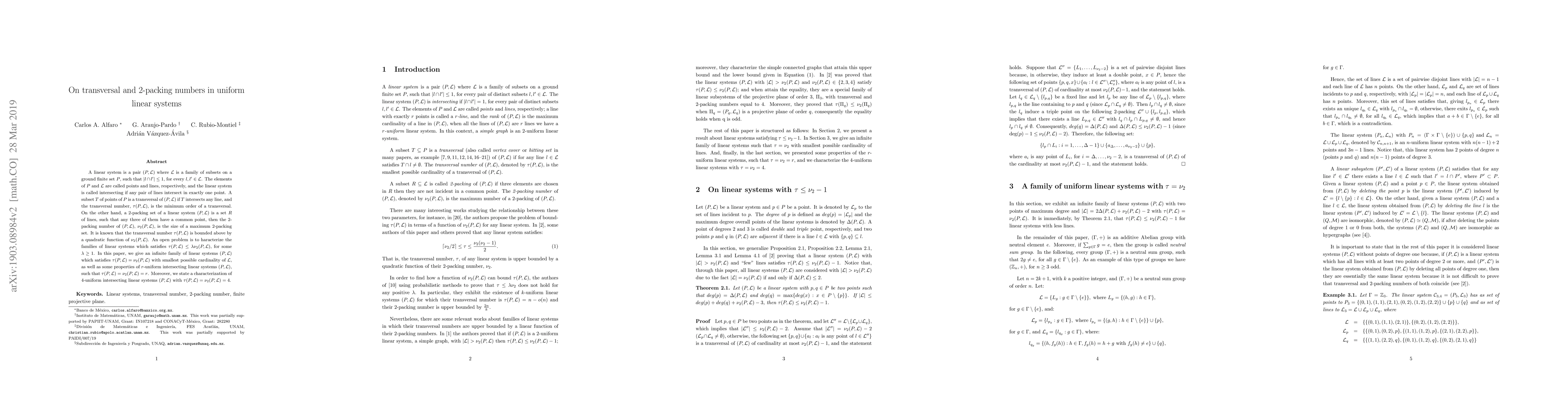 This paper explores transversal and 2-packing numbers in uniform linear systems, presenting an infinite family where the transversal number equals the 2-packing number with minimal line cardinality. It also characterizes 4-uniform intersecting linear systems where both numbers equal 4.