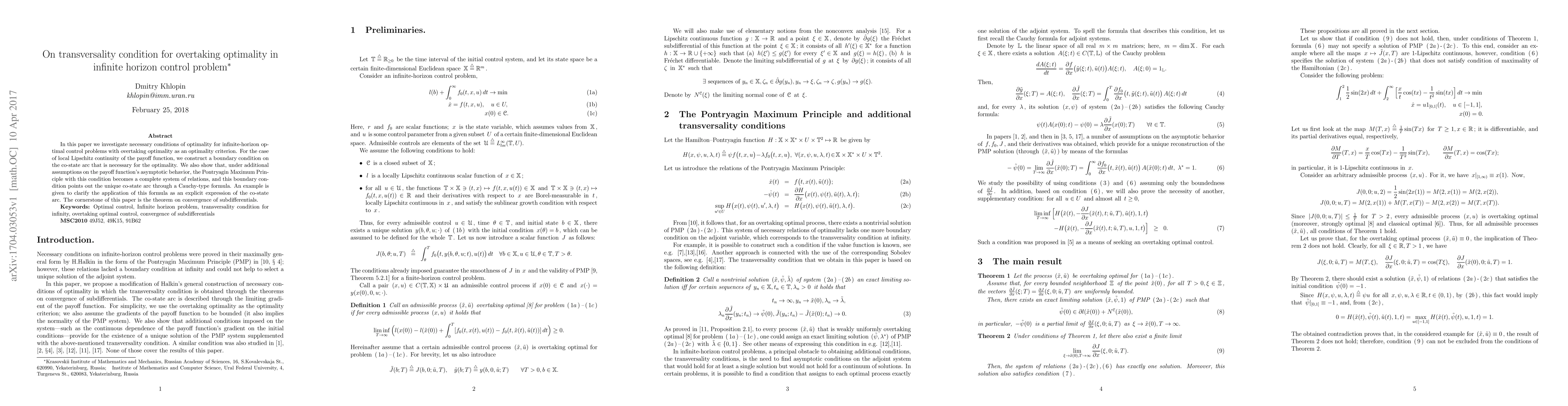 This paper explores necessary conditions for optimality in infinite-horizon control problems using overtaking optimality. It constructs a boundary condition for the co-state arc under local Lipschitz continuity, showing that this condition, along with the Pontryagin Maximum Principle, forms a complete system of relations for unique co-state determination.