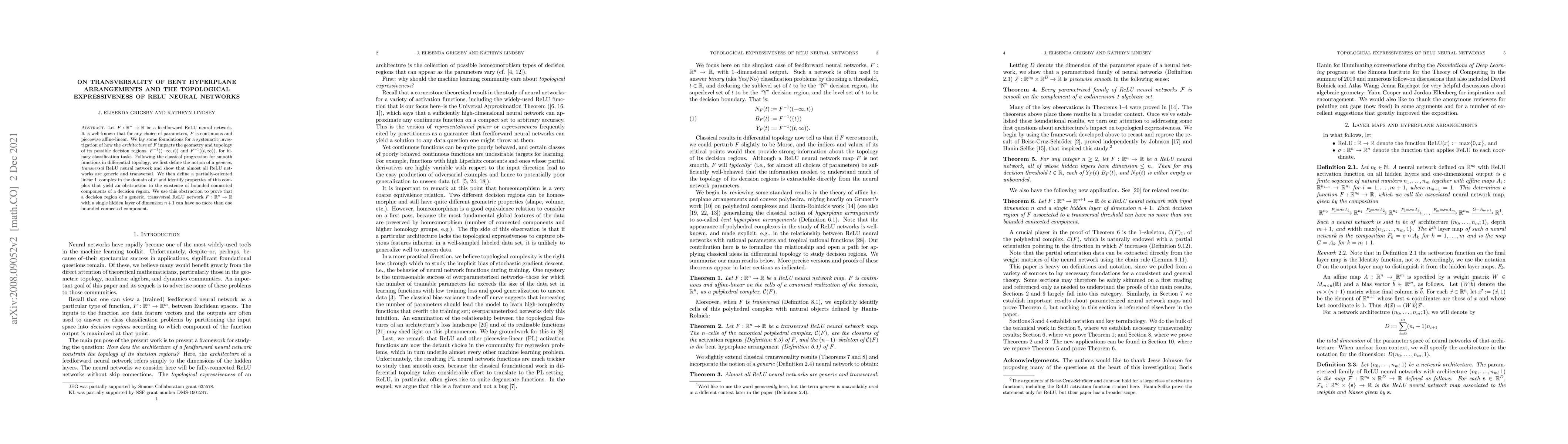 This paper investigates the transversality of bent hyperplane arrangements in ReLU neural networks and their topological expressiveness. It establishes that almost all ReLU networks are generic and transversal, and proves that a single-layer ReLU network with n+1 hidden units cannot have more than one bounded connected component in its decision region.