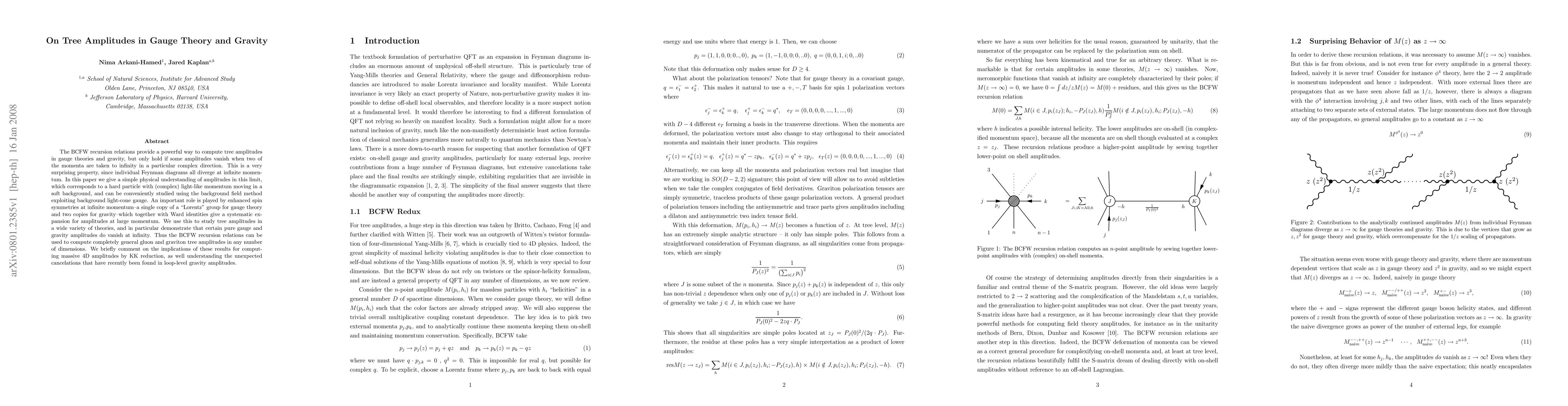 This paper explains the BCFW recursion relations for computing tree amplitudes in gauge theories and gravity, providing a physical interpretation of these amplitudes when two momenta approach infinity. It uses enhanced spin symmetries and the background field method to show that certain amplitudes vanish at infinity, thereby justifying the use of BCFW recursion relations for general gluon and graviton tree amplitudes.