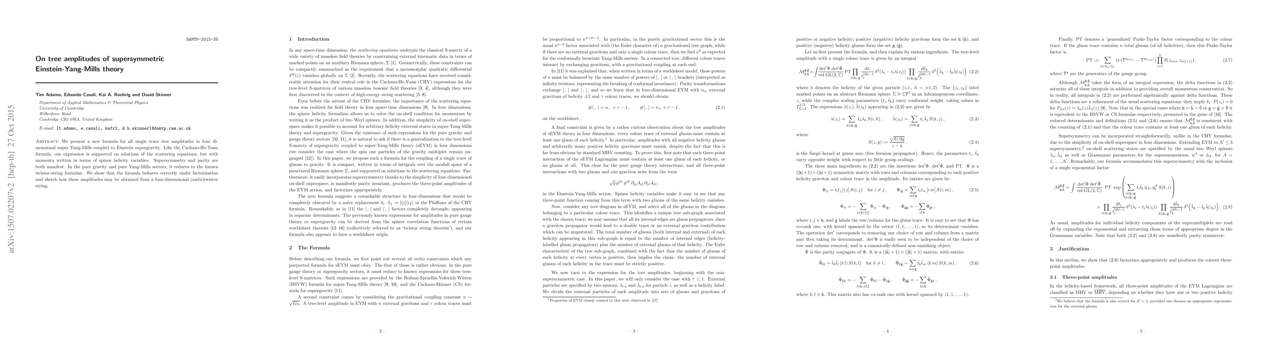 We present a new formula for all single trace tree amplitudes in four dimensional super Yang-Mills coupled to Einstein supergravity. Like the Cachazo-He-Yuan formula, our expression is supported on solutions of the scattering equations, but with momenta written in terms of spinor helicity variables. Supersymmetry and parity are both manifest. In the pure gravity and pure Yang-Mills sectors, it reduces to the known twistor-string formulae. We show that the formula behaves correctly under factorization and sketch how these amplitudes may be obtained from a four-dimensional (ambi)twistor string.