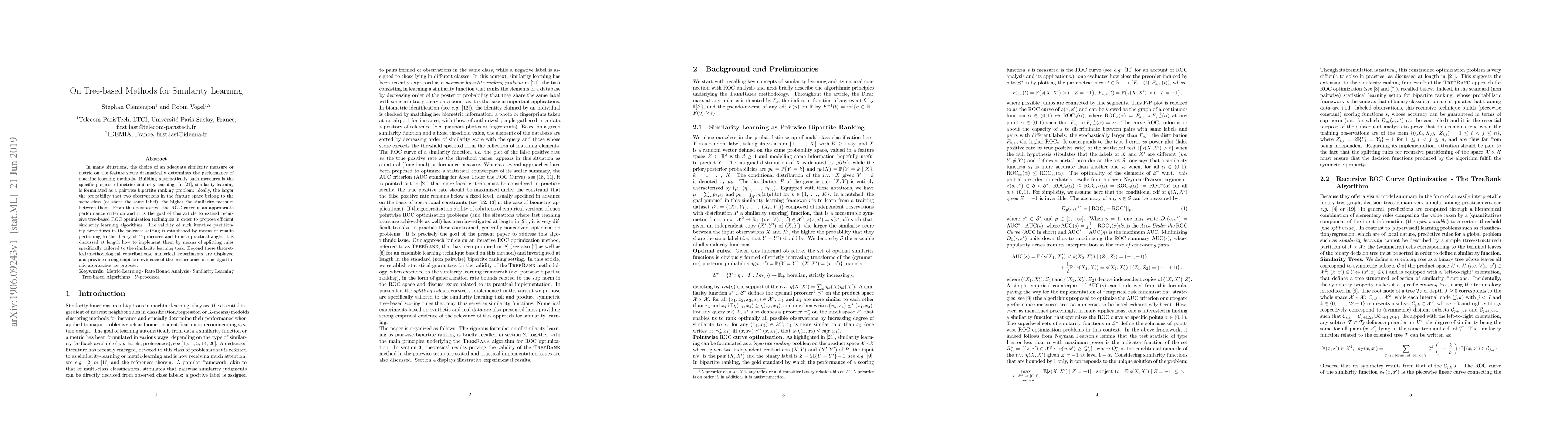 In many situations, the choice of an adequate similarity measure or metric on the feature space dramatically determines the performance of machine learning methods. Building automatically such measures is the specific purpose of metric/similarity learning. In Vogel et al. (2018), similarity learning is formulated as a pairwise bipartite ranking problem: ideally, the larger the probability that two observations in the feature space belong to the same class (or share the same label), the higher the similarity measure between them. From this perspective, the ROC curve is an appropriate performance criterion and it is the goal of this article to extend recursive tree-based ROC optimization techniques in order to propose efficient similarity learning algorithms. The validity of such iterative partitioning procedures in the pairwise setting is established by means of results pertaining to the theory of U-processes and from a practical angle, it is discussed at length how to implement them by means of splitting rules specifically tailored to the similarity learning task. Beyond these theoretical/methodological contributions, numerical experiments are displayed and provide strong empirical evidence of the performance of the algorithmic approaches we propose.