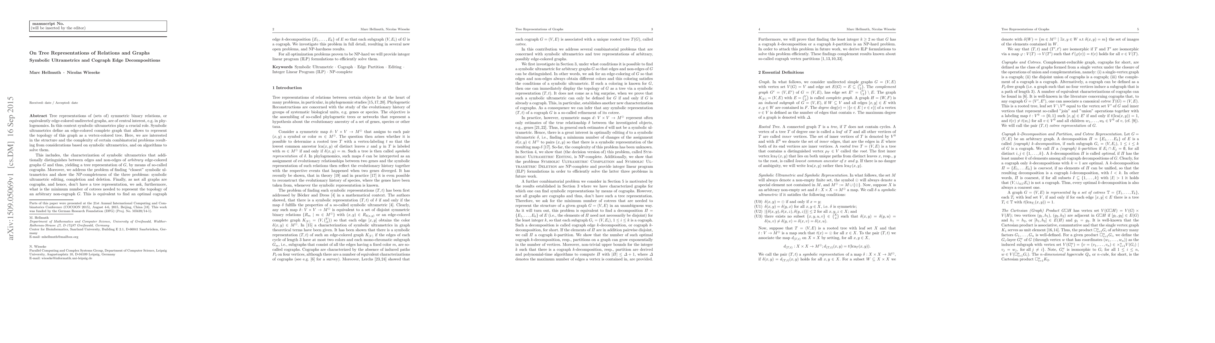 Tree representations of (sets of) symmetric binary relations, or equivalently edge-colored undirected graphs, are of central interest, e.g.\ in phylogenomics. In this context symbolic ultrametrics play a crucial role. Symbolic ultrametrics define an edge-colored complete graph that allows to represent the topology of this graph as a vertex-colored tree. Here, we are interested in the structure and the complexity of certain combinatorial problems resulting from considerations based on symbolic ultrametrics, and on algorithms to solve them. This includes, the characterization of symbolic ultrametrics that additionally distinguishes between edges and non-edges of \emph{arbitrary} edge-colored graphs $G$ and thus, yielding a tree representation of $G$, by means of so-called cographs. Moreover, we address the problem of finding "closest" symbolic ultrametrics and show the NP-completeness of the three problems: symbolic ultrametric editing, completion and deletion. Finally, as not all graphs are cographs, and hence, don't have a tree representation, we ask, furthermore, what is the minimum number of cotrees needed to represent the topology of an arbitrary non-cograph $G$. This is equivalent to find an optimal cograph edge $k$-decomposition $\{E_1,\dots,E_k\}$ of $E$ so that each subgraph $(V,E_i)$ of $G$ is a cograph. We investigate this problem in full detail, resulting in several new open problems, and NP-hardness results. For all optimization problems proven to be NP-hard we will provide integer linear program (ILP) formulations to efficiently solve them.