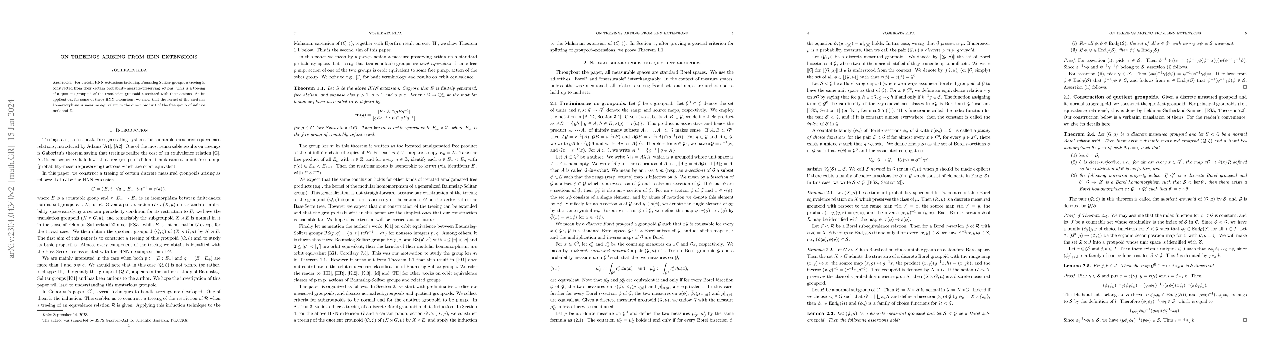 Summary: The paper constructs treeings from HNN extensions, particularly Baumslag-Solitar groups, using probability-measure-preserving actions. It demonstrates that the kernel of the modular homomorphism for some of these extensions is measure equivalent to the direct product of a free group of infinite rank and Z.