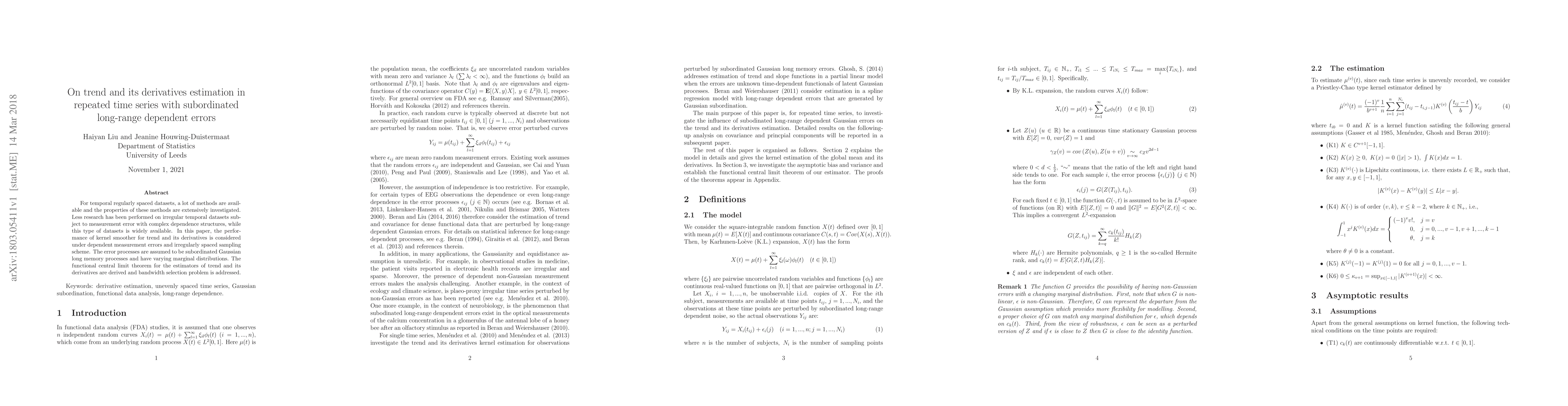 For temporal regularly spaced datasets, a lot of methods are available and the properties of these methods are extensively investigated. Less research has been performed on irregular temporal datasets subject to measurement error with complex dependence structures, while this type of datasets is widely available. In this paper, the performance of kernel smoother for trend and its derivatives is considered under dependent measurement errors and irregularly spaced sampling scheme. The error processes are assumed to be subordinated Gaussian long memory processes and have varying marginal distributions. The functional central limit theorem for the estimators of trend and its derivatives are derived and bandwidth selection problem is addressed.