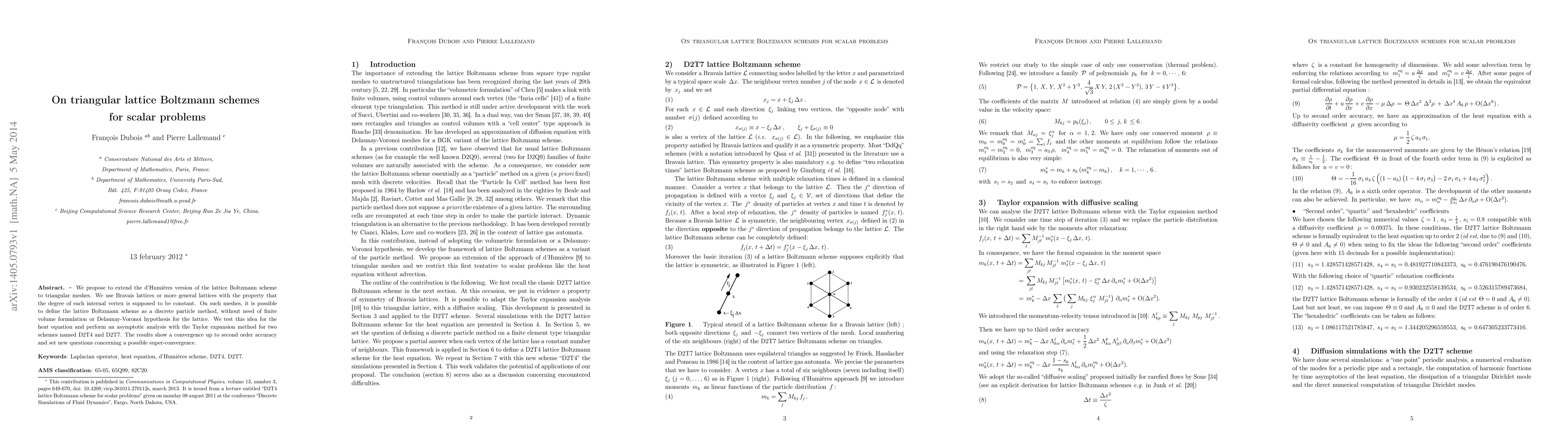 Researchers proposed a new lattice Boltzmann scheme for solving scalar problems on triangular meshes, demonstrating second-order convergence in heat equation simulations and raising questions about potential super-convergence.