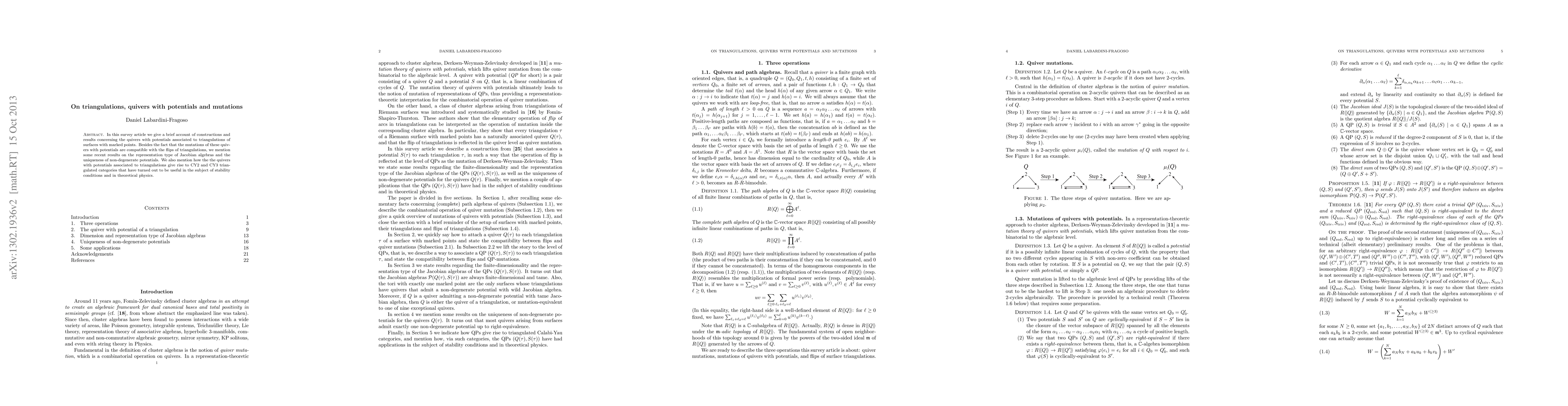 This paper surveys the constructions and results related to quivers with potentials linked to triangulations of surfaces with marked points, highlighting the compatibility of mutations with triangulation flips and recent findings on Jacobian algebras' representation types and potential uniqueness. It also discusses the emergence of CY2 and CY3 triangulated categories from these quivers, which are significant in stability conditions and theoretical physics.