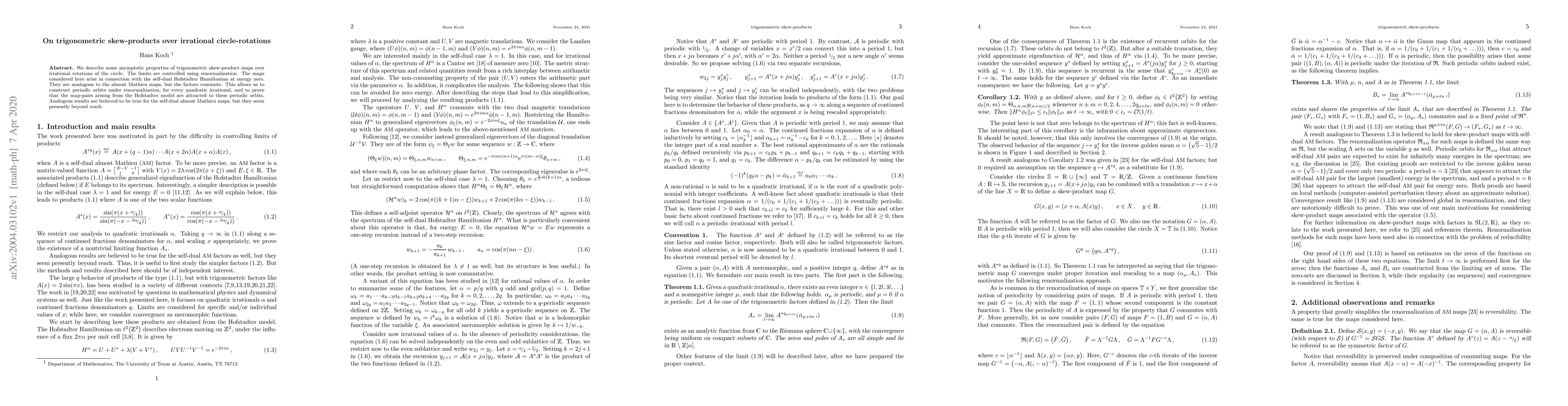 This paper explores the asymptotic properties of trigonometric skew-product maps over irrational circle rotations, using renormalization to control limits. It constructs periodic orbits for every quadratic irrational and proves attraction to these orbits for the Hofstadter Hamiltonian at energy zero.