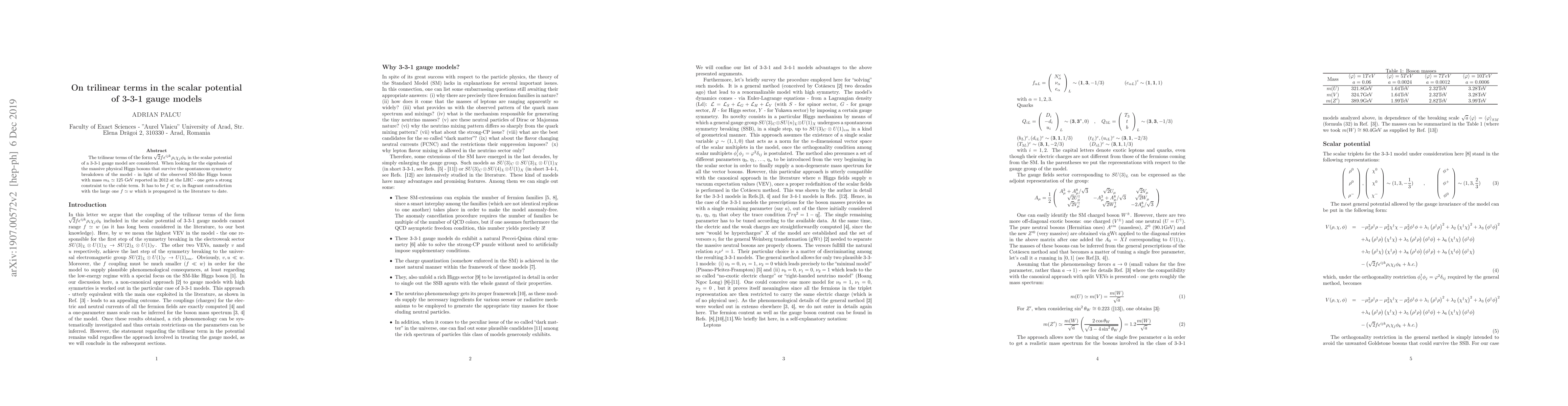 The trilinear terms {\normalsize of the form $\sqrt{2} f\epsilon^{ijk} \rho_i \chi_j\phi_k$} in the scalar potential of a 3-3-1 gauge model are considered. When looking for the eigenbasis of the massive physical Higgs bosons that survive the spontaneous symmetry breakdown of the model -- in light of the observed SM-like Higgs boson with mass $m_{h}\simeq125$ GeV reported in 2012 at the LHC -- one gets a strong constraint to the cubic term. It has to be smaller than usual $f\ll w$, in flagrant contradiction with the large one $f\simeq w$ which is propagated in the literature to date.