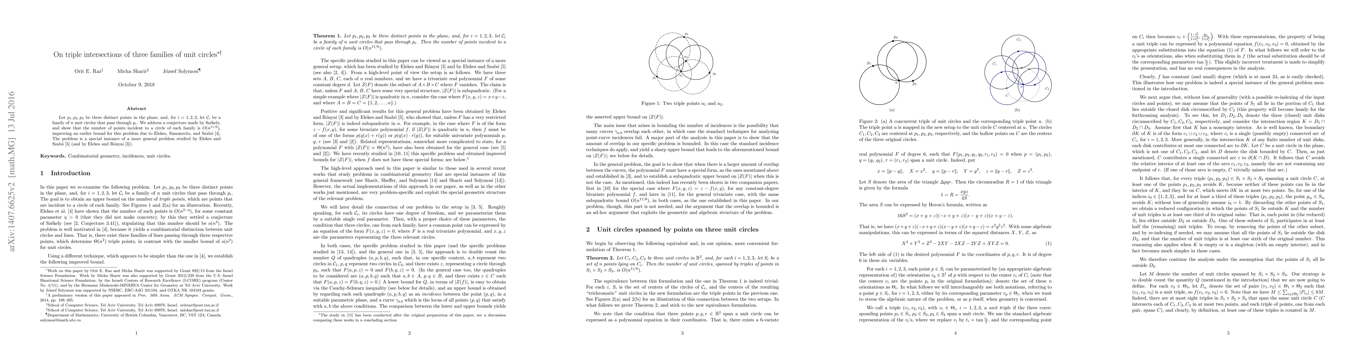 Let $p_1,p_2,p_3$ be three distinct points in the plane, and, for $i=1,2,3$, let $\mathcal C_i$ be a family of $n$ unit circles that pass through $p_i$. We address a conjecture made by Sz\'ekely, and show that the number of points incident to a circle of each family is $O(n^{11/6})$, improving an earlier bound for this problem due to Elekes, Simonovits, and Szab\'o [Combin. Probab. Comput., 2009]. The problem is a special instance of a more general problem studied by Elekes and Szab\'o [Combinatorica, 2012] (and by Elekes and R\'onyai [J. Combin. Theory Ser. A, 2000]).