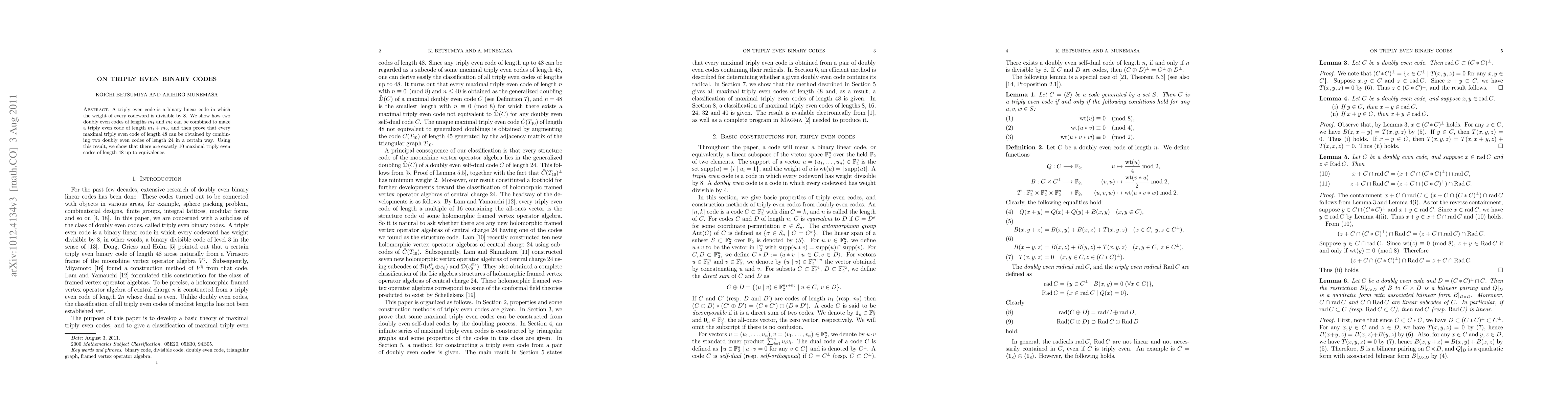 This paper explores the construction and properties of triply even binary codes, demonstrating how combining two doubly even codes creates a triply even code, and proving that all maximal triply even codes of length 48 arise from such combinations, resulting in exactly 10 distinct maximal codes.