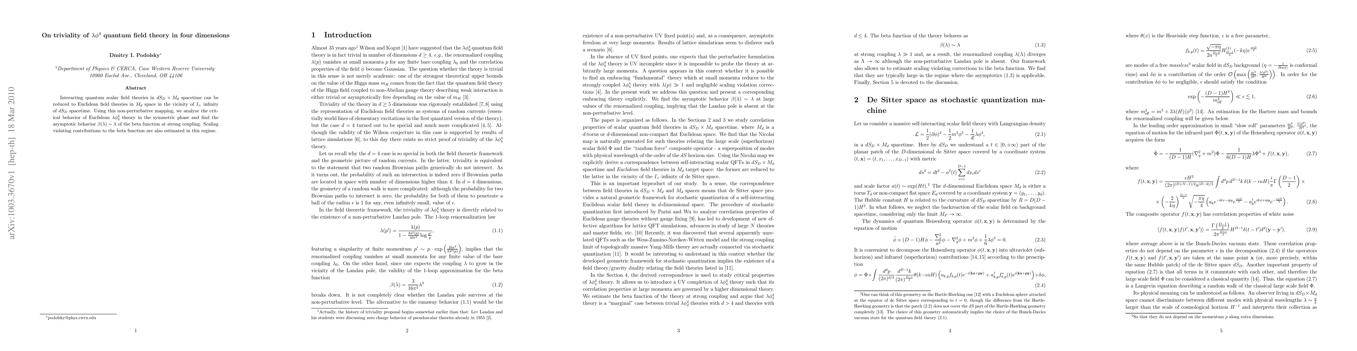 Interacting quantum scalar field theories in $dS_D\times M_d$ spacetime can be reduced to Euclidean field theories in $M_d$ space in the vicinity of $I_+$ infinity of $dS_D$ spacetime. Using this non-perturbative mapping, we analyze the critical behavior of Euclidean $\lambda\phi_4^4$ theory in the symmetric phase and find the asymptotic behavior $\beta(\lambda)\sim \lambda$ of the beta function at strong coupling. Scaling violating contributions to the beta function are also estimated in this regime.