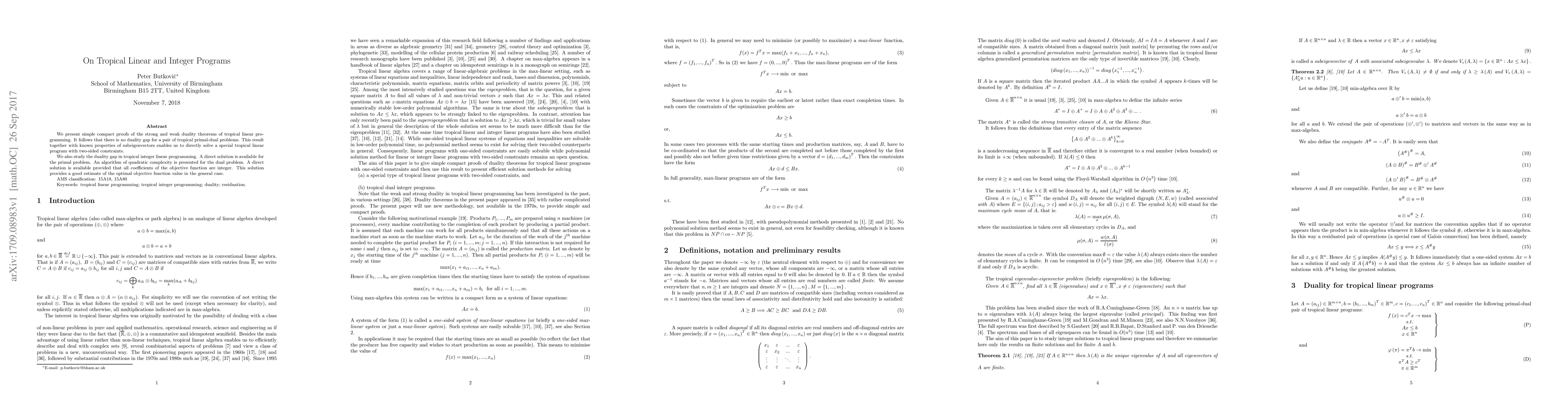 The paper offers compact proofs of tropical linear programming duality theorems and presents direct solution methods for specific tropical linear and integer programs, along with a quadratic complexity algorithm for the dual problem in tropical integer linear programming.