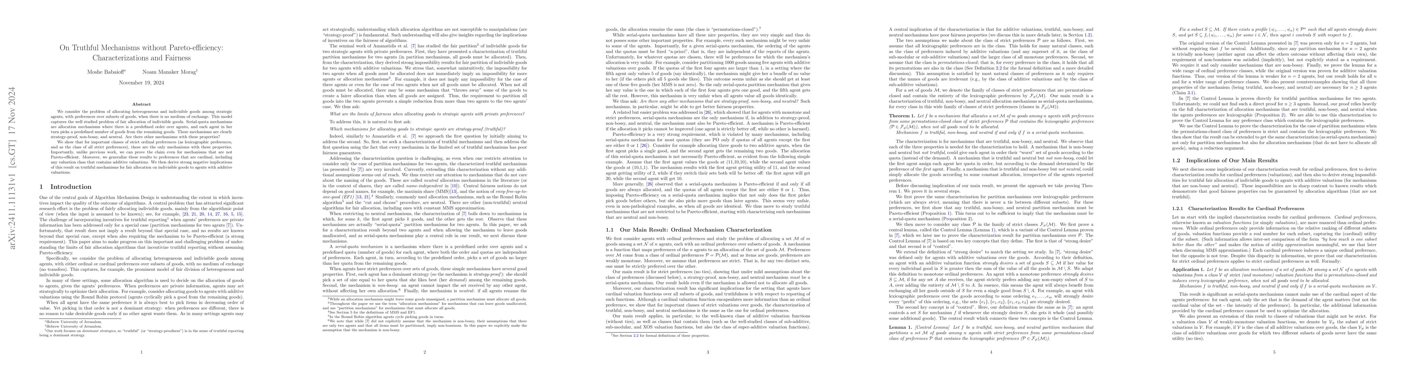 The paper investigates the allocation of indivisible goods among strategic agents without a medium of exchange, focusing on serial-quota mechanisms. It demonstrates that these mechanisms are the only truthful, non-bossy, and neutral options for certain classes of preferences, even when not Pareto-efficient, and extends the findings to cardinal preferences including additive valuations.