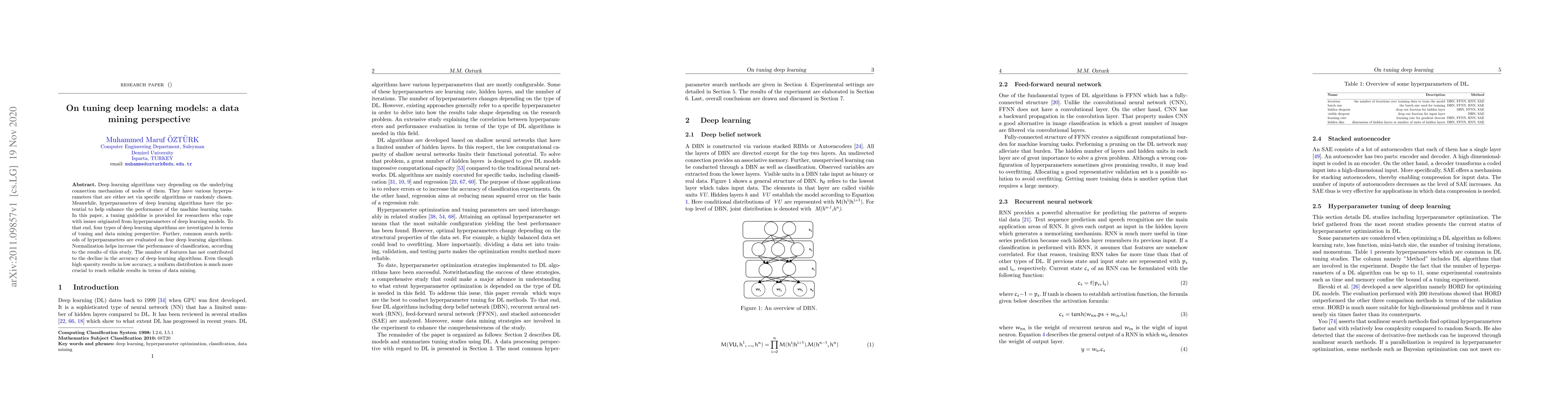 Deep learning algorithms vary depending on the underlying connection mechanism of nodes of them. They have various hyperparameters that are either set via specific algorithms or randomly chosen. Meanwhile, hyperparameters of deep learning algorithms have the potential to help enhance the performance of the machine learning tasks. In this paper, a tuning guideline is provided for researchers who cope with issues originated from hyperparameters of deep learning models. To that end, four types of deep learning algorithms are investigated in terms of tuning and data mining perspective. Further, common search methods of hyperparameters are evaluated on four deep learning algorithms. Normalization helps increase the performance of classification, according to the results of this study. The number of features has not contributed to the decline in the accuracy of deep learning algorithms. Even though high sparsity results in low accuracy, a uniform distribution is much more crucial to reach reliable results in terms of data mining.