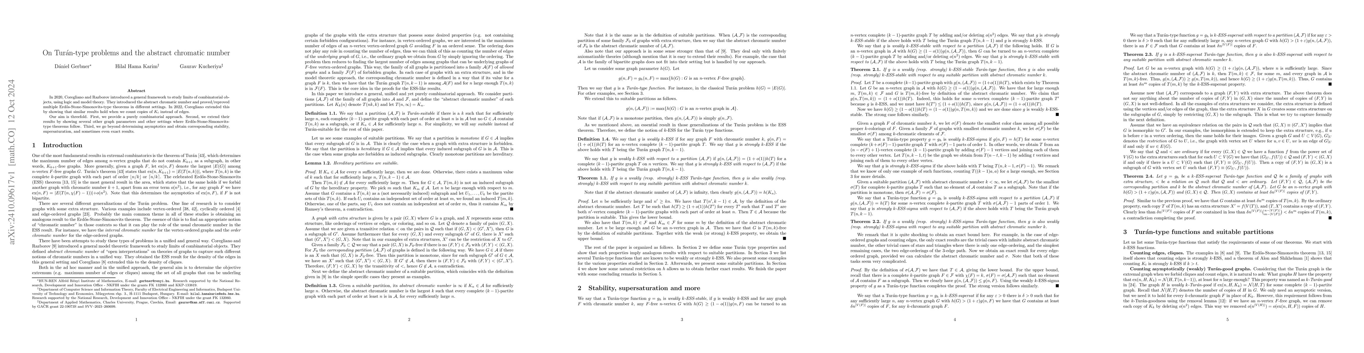 This paper presents a combinatorial approach to Turán-type problems and explores the abstract chromatic number, extending existing results to various graph parameters and settings, and achieving stability, supersaturation, and exact results beyond asymptotic determinations.