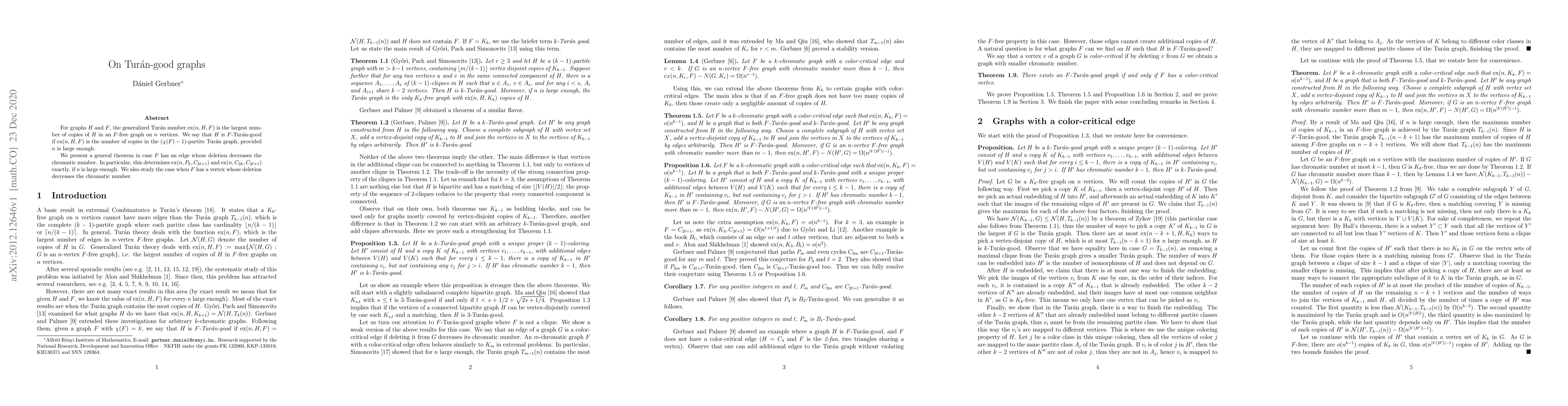 Summary: This paper studies the generalized Turán number $ex(n,H,F)$ for graphs $H$ and $F$, defining $H$ as $F$-Turán-good if it matches the number of copies in a $(\chi(F)-1)$-partite Turán graph for large $n$. The authors present a theorem for $F$ where an edge deletion reduces chromatic number, determining exact values for $ex(n,P_k,C_{2\ell+1})$ and $ex(n,C_{2k},C_{2\ell+1})$ under these conditions.