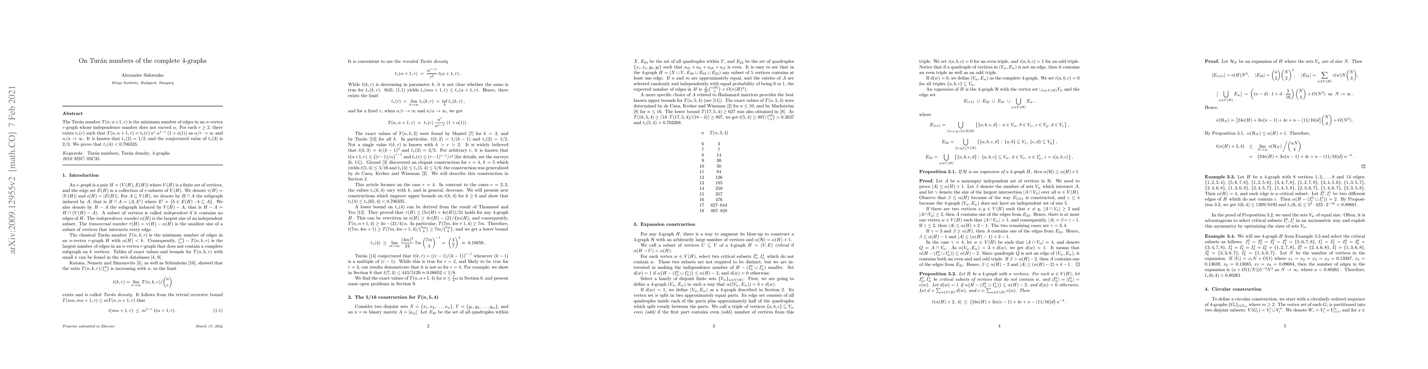This paper investigates Turán numbers for complete 4-graphs, determining that the threshold $t_*(4)$ is less than approximately 0.706335, contributing to understanding the maximum edge density in 4-uniform hypergraphs without large independent sets.