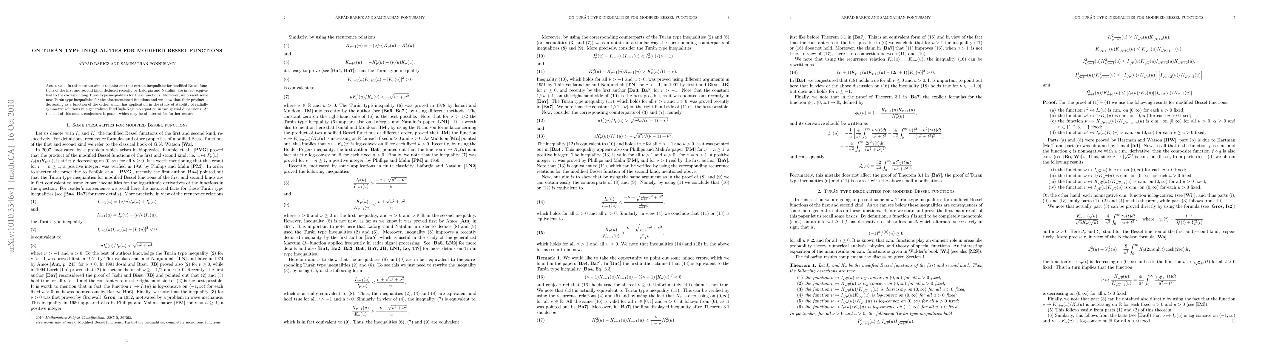 This paper establishes the equivalence between recent inequalities for modified Bessel functions and Tur\'an type inequalities, introduces new Tur\'an type inequalities, and demonstrates the decreasing nature of their product with respect to order. The findings have implications for the stability analysis of radially symmetric solutions in a generalized FitzHugh-Nagumo equation.